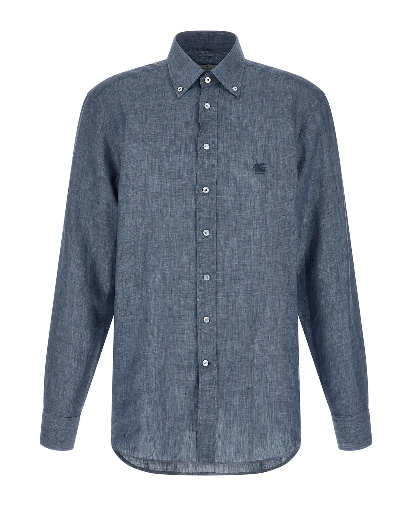 Melange linen shirt with tone-on-tone 'Pegaso' embroidered logo, front button closure, long cuffed sleeves. Composition: 100% linen Made in: Italy Color: Blue Size and fit: - Roma fit - COLLAR size Model number: MRIB000499TU3F3B0068