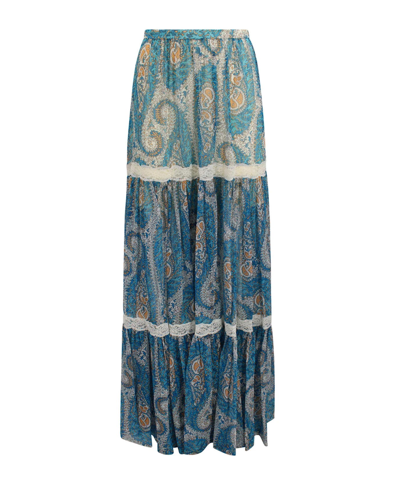 Long skirt crafted in lightweight fabric featuring a paisley print and lace trim. Finished with an elasticated waist for comfortable fit. Features Color: blue with paisley print Lace trim Elasticated waist Origin: Italy Composition: 100% Silk Made in: Italy Size and fit: - Fits true to size Model number: WRFA018399SA101X0809