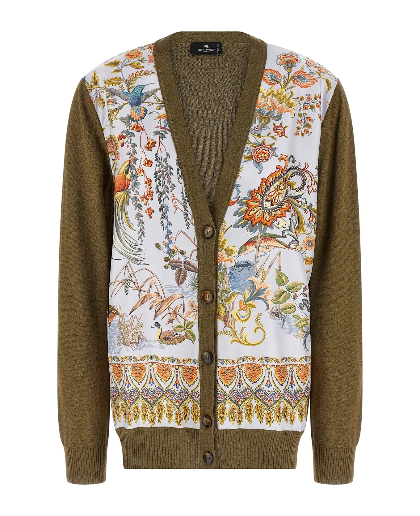 Cardigan in cotton blend and solid color viscose with silk insert Paisley foliage pattern on the front, V-neck, button closure, long cuffed sleeves, band on the hem. Composition: 60% cotton 40% viscose Made in: Italy Color: Green Size and fit: - true to size fit Model number: WRKE0182AV868X0882