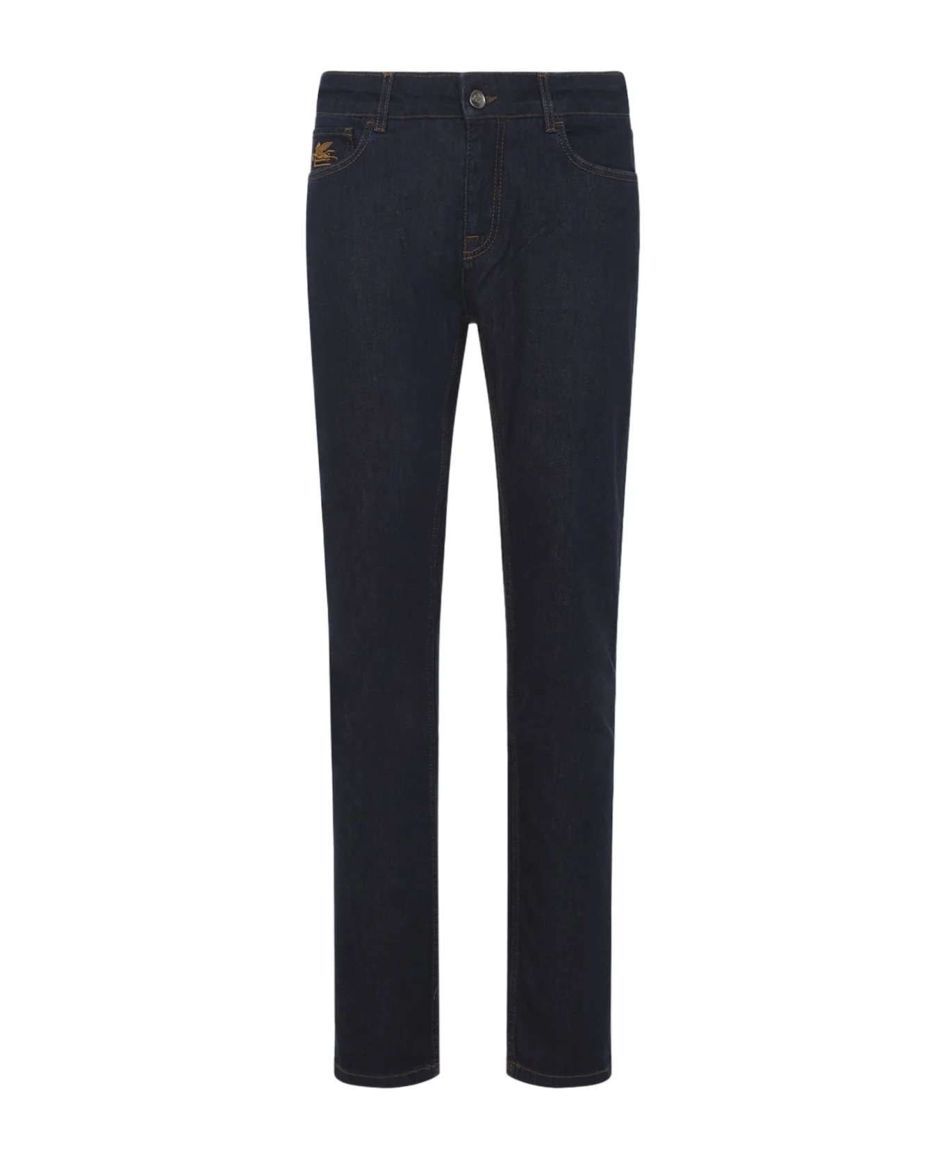 Etro Roma Dark Blue Cotton Jeans. Five-pocket jeans crafted from dark blue cotton denim with slight stretch, it features belt loops, front button and zip fly, the Pegaso logo embroidered on the front, a branded leather label at the back of the waist, and a straight leg. Made in: Albania Color: Dark Blue Model number: MRNB0004AD333S9090