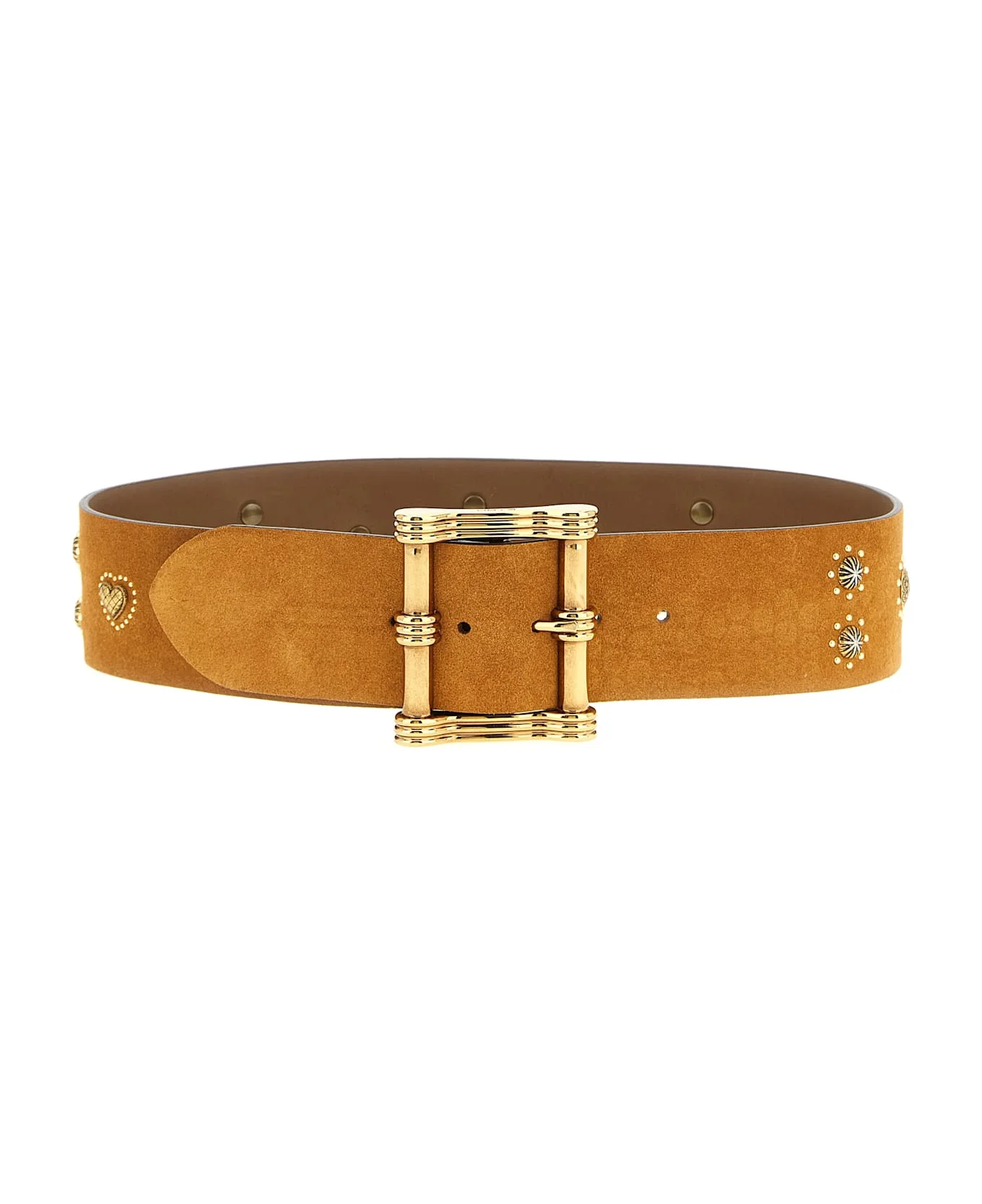 Suede belt with metal stud applique, maxi gold pin buckle with grooves. Composition: 100% calfskin leather (Bos Taurus) Made in: Italy Color: Brown Size and fit: - H 6 cm Model number: WP3B0072AE312M0448