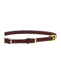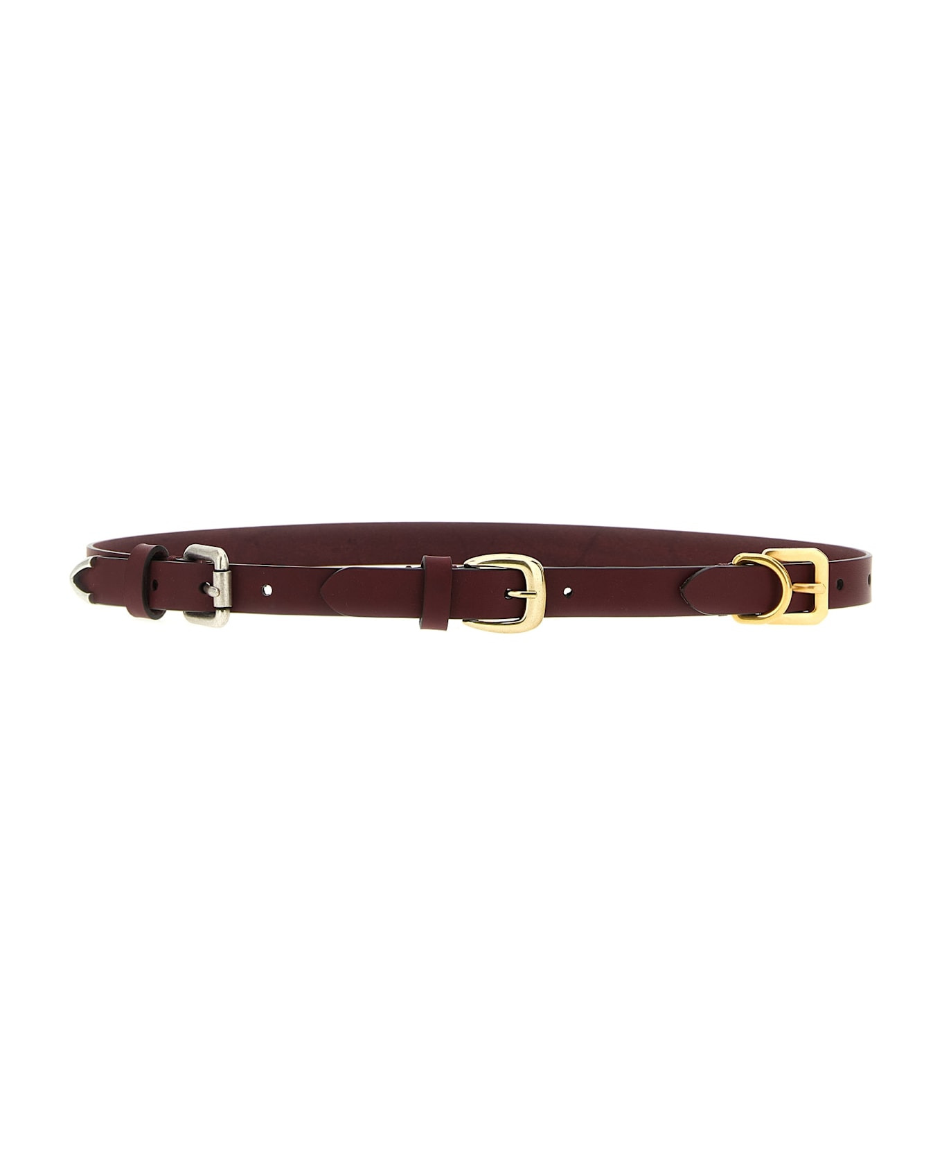 Leather belt with triple antiqued metal buckle. Composition: 100% calfskin leather (Bos Taurus) Made in: Italy Color: Bordeaux Size and fit: - H 2 cm Model number: WP3B0052AP399R0108