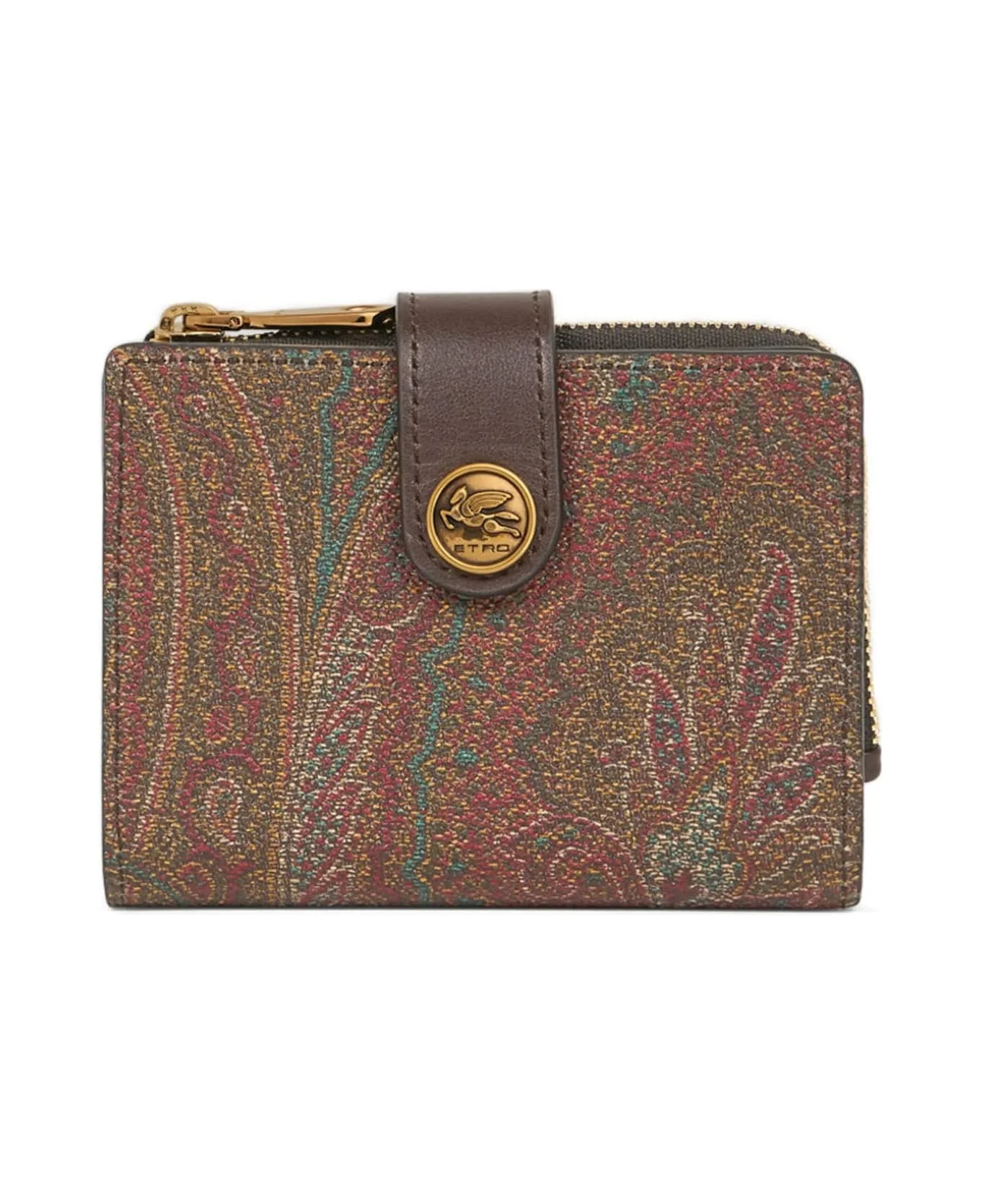 Wallet in iconic Paisley jacquard fabric embellished with a metal button bearing the raised Pegaso symbol and an etched Etro logo on the inside, Dimensions (Width, Height): 4. 3 x 3. 1 inches (11 x 8 cm), Flap and press-stud closure, Golden-finish metal details, Pegaso button, Zipped main pocket, Six card slots Composition: 76% Cotton, 24% Polyester Composition: 76% Cotone, 24% Poliestere Spalmatura 100 Made in: Italy Color: Brown Model number: WP2D0014AA027M0019