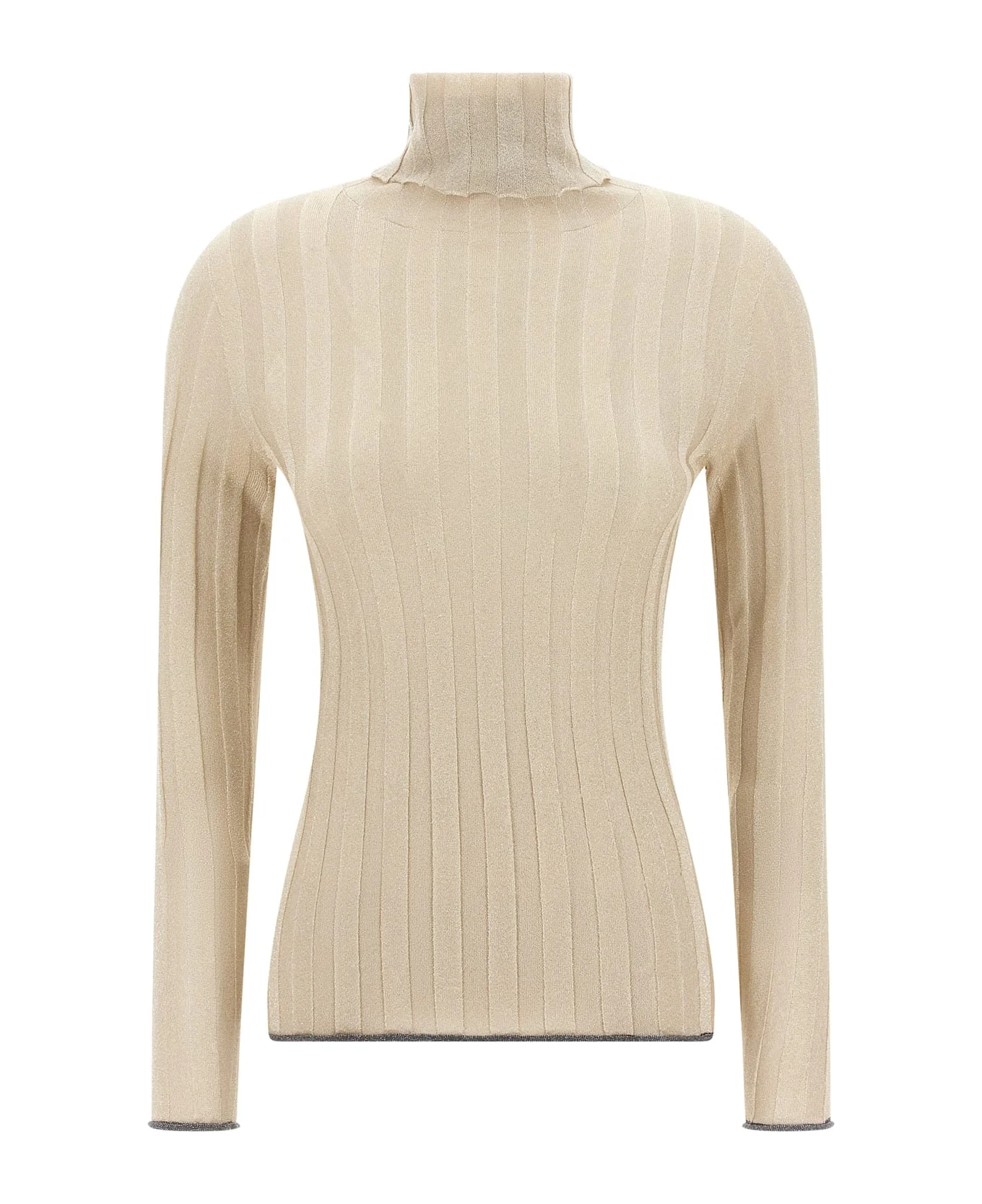 Ribbed stretch lurex viscose sweater, turned-up collar, long sleeves, contrast piping. Composition: 77% viscose, 23% polyester Made in: Italy Color: Gold Size and fit: - true to size fit Model number: MAD225F518L624VR1