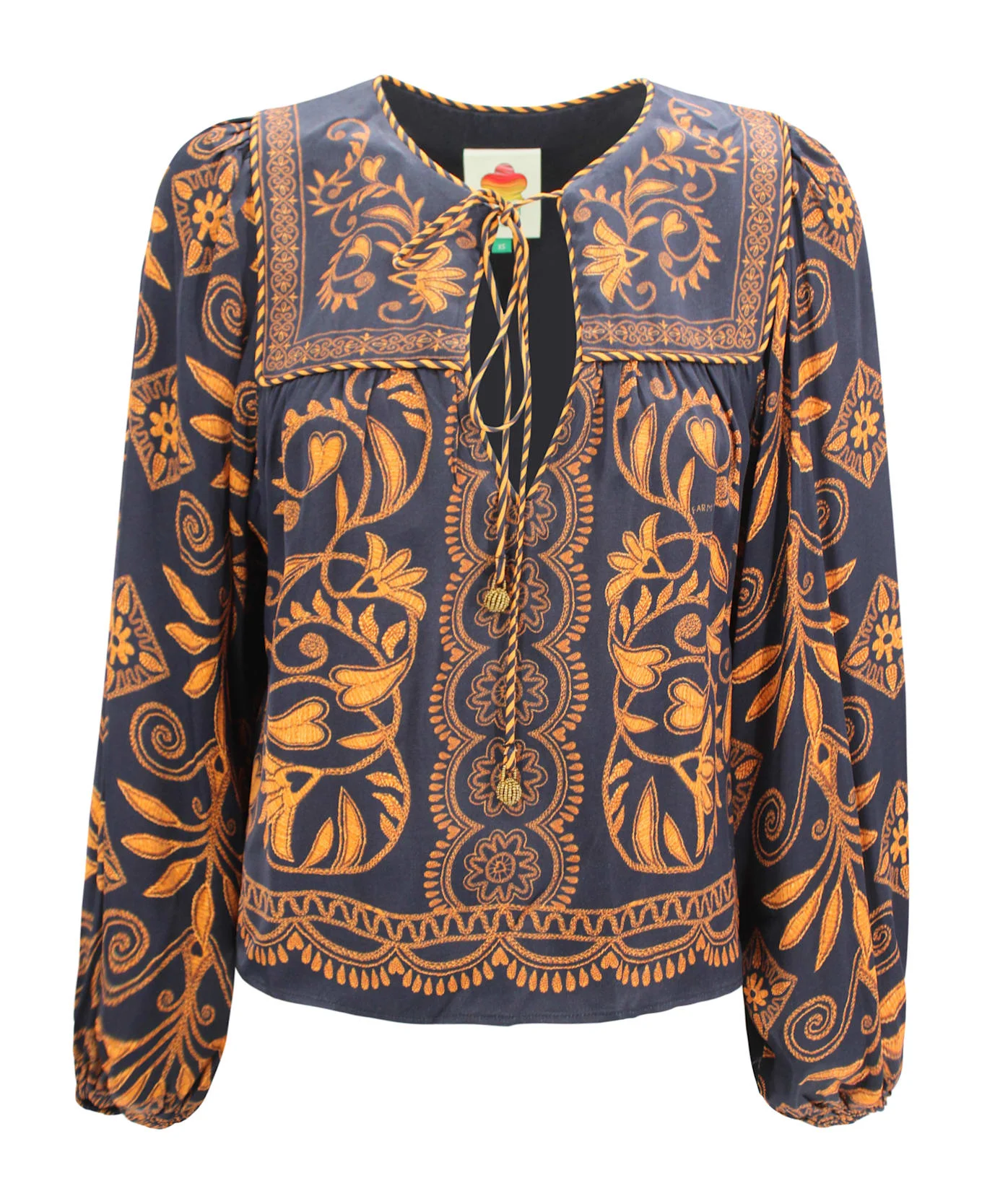 Blouse crafted in black fabric with a floral print, featuring a crew neckline and long sleeves. The design includes a drawstring fastening and buttoned cuffs, offering a feminine and adjustable fit. Features Color: black Floral print Crew neckline Long sleeves Drawstring fastening Buttoned cuffs Composition: 100% Cotton Made in: China Color: Black Size and fit: - Fits true to size Model number: 34414426028