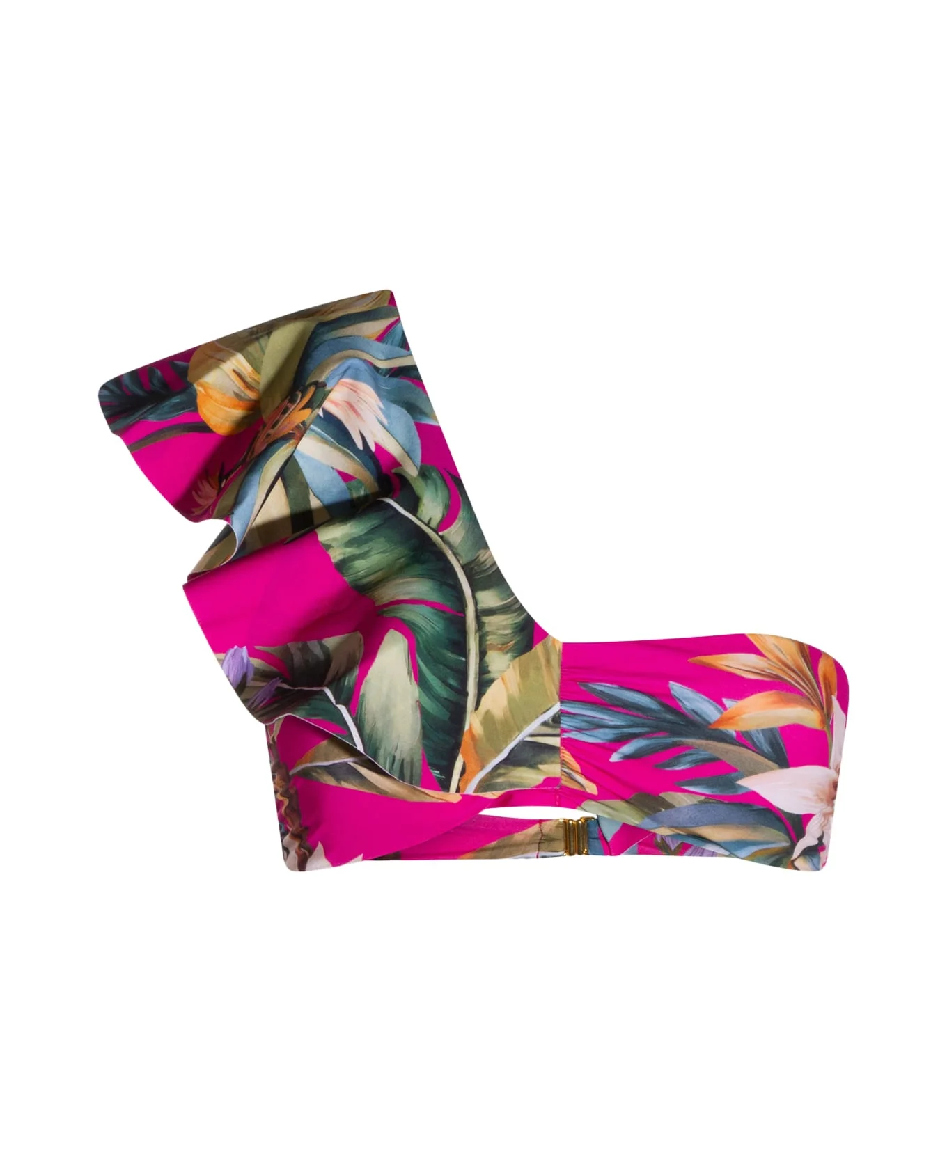 Pink top beachwear from Farm Rio featuring one shoulder, back fastening, all over stamp and regular vestibility. Composition: _ 75,5 Pa 24,5 Ea Made in: Colombia Color: BIRD LEAVES SAND Model number: 34465826101
