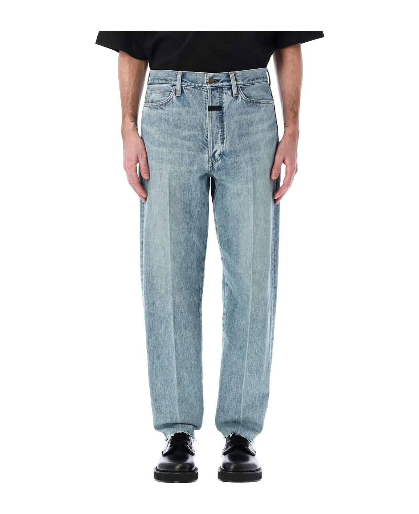 80s 5 Pockets Jean By Fear Of God. Featuring: Washed Denim Button Fly 5 Pockets Logo Label At Centre Front Raw Ankle Hem Straight Leg Model Is 1,90 M And Wears Size 32 Composition: 100% cotton Made in: Japan Color: INDIGO 2 Model number: FGE240410DNM436