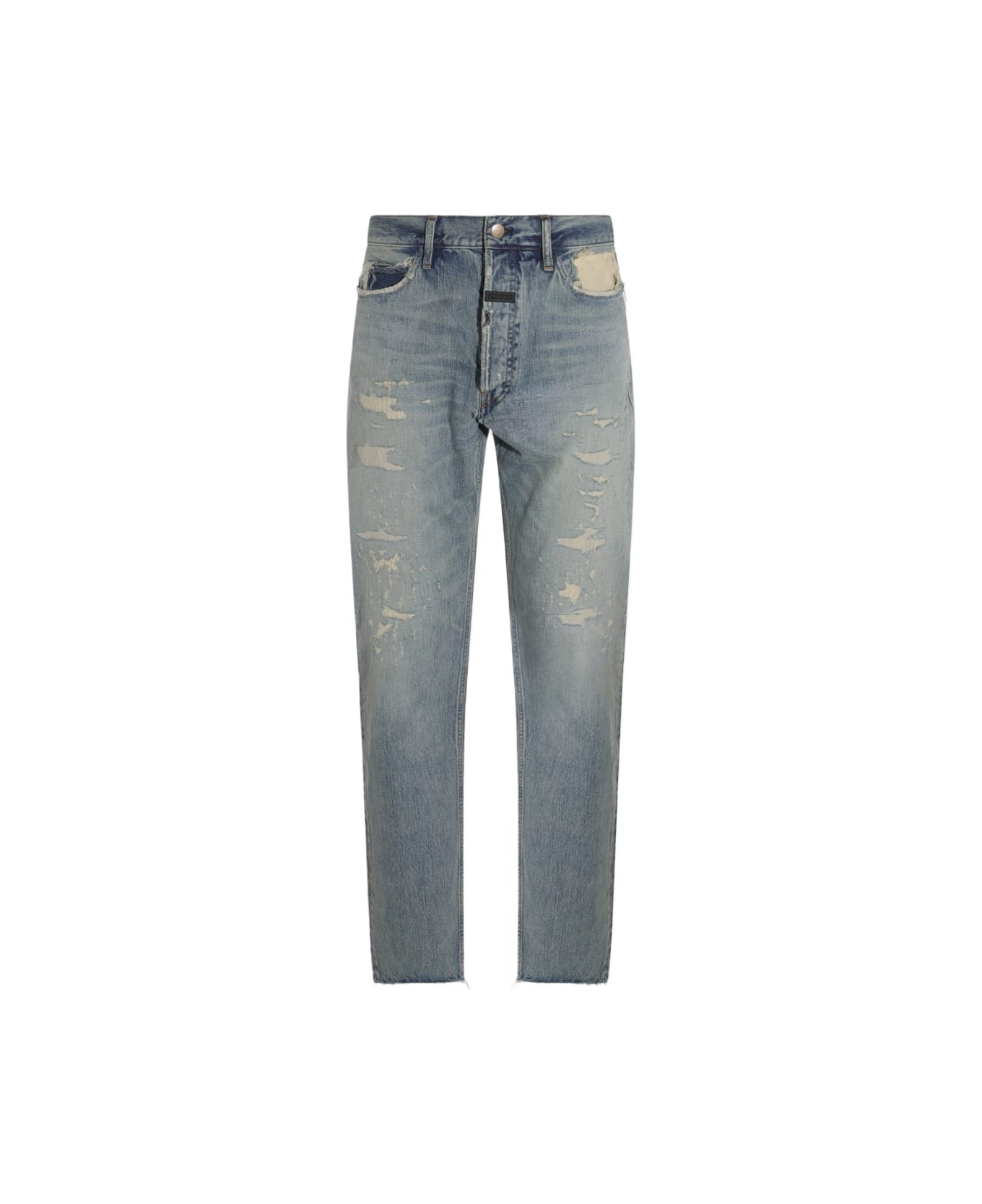 Light blue cotton denim jeans from Fear of God featuring belt loops, frontal fastening, pockets, tears details and patched logo. Composition: _, 100% Cotton Made in: Japan Color: REPAIRED INDIGO Model number: FGE240408DNM409