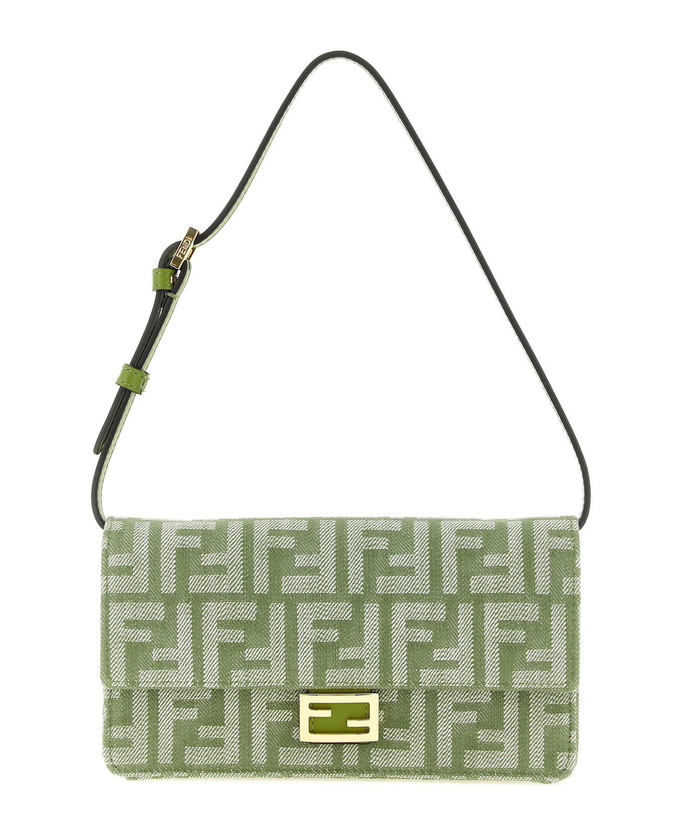 'Baguette' wallet on chain in denim-effect FF jacquard, flap closure with snap button and front metal FF logo, leather lining, adjustable and removable leather handle, removable chain shoulder strap. Composition: 38% cotton 21% polyamide 21% polyurethane 20% polyester Made in: Italy Color: Green Size and fit: - W 21 x H 11.5 x D 5 cm Model number: 8M0498AUT4F1VG0