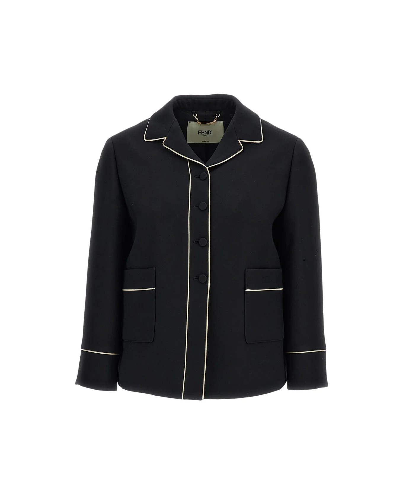 Tailored jacket with a pajama collar and long sleeves Featuring patch pockets on the front Front closure with four tonal covered buttons Finished with contrast piping along the edges Fully lined interior Color: Black Made in Italy Composition: 77% Wool, 23% Silk Made in: Italy Color: Black Model number: FJ7665AC4GF0GME