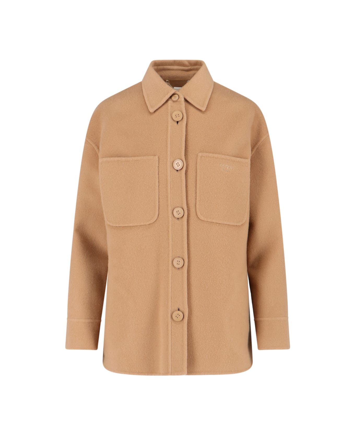 Fendi brown cashmere shirt jacket with classic collar, button closure, dropped shoulders, two front patch pockets, tone-on-tone embroidered logo on the front, removable and adjustable strap detail, button cuffs, straight hem. Composition: 100% Cashmere Made in: Italy Color: Brown Size and fit: - Vestibilita regolare Model number: FJ7235W18F0QU5