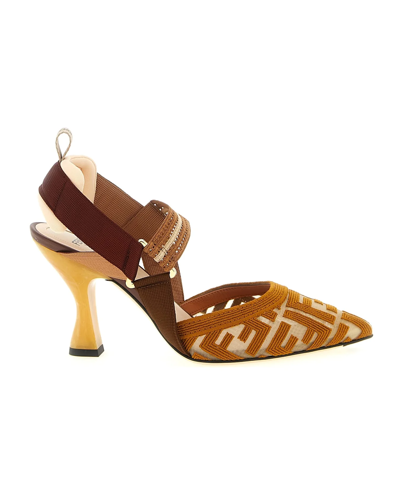 'Colibri' mesh slingbacks with Cornely FF embroidery, pointed toe, back strap with padded pad and trekking hook, elastic top strap, resin-coated heel with marbled effect, leather sole with rubber island. Composition: 100% polyamide Made in: Italy Color: Brown Size and fit: - EU WOMAN - Heels: 8,5 cm Model number: 8J8875AWCXF1V8T
