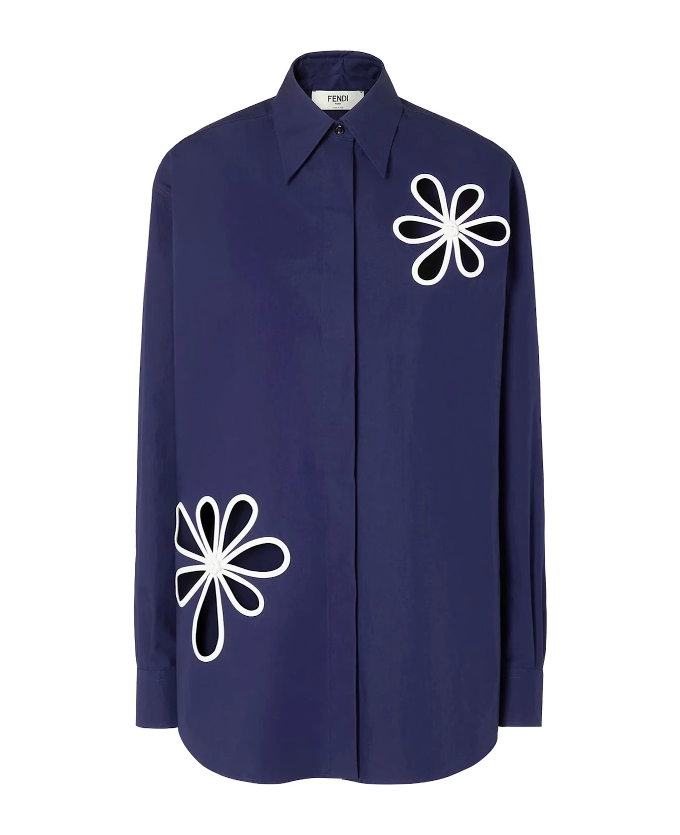 Fendi Ajour motif Cut-out details Hidden button closure Pointed collar Made in Italy 100% cotton SKU: FS8355AW7VF1W0A Made in: Italy Color: INCHIOSTRO 26 Model number: FS8355AW7VF1W0A