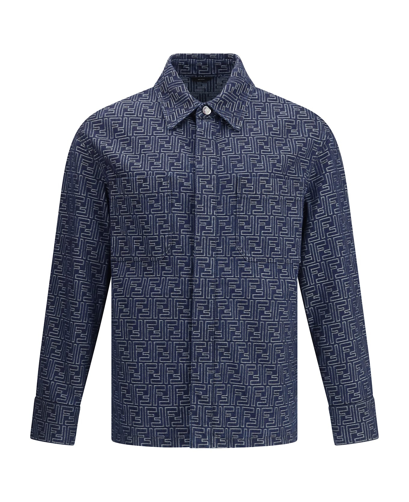 Denim jacket by fendi, inspired by the classic shirt pattern and featuring a denim design with the iconic all-over ff jacquard weave. the garment features a classic collar, front snap-button closure, two side welt pockets and two slit pockets applied to the front. the cuffs are button-adjustable for a customized fit. a casual-luxury style garment perfect for enhancing your wardrobe with a distinctive touch. Composition: 100% % Cotton Made in: Italy Color: Buz Indigo Model number: FW1321AUX4