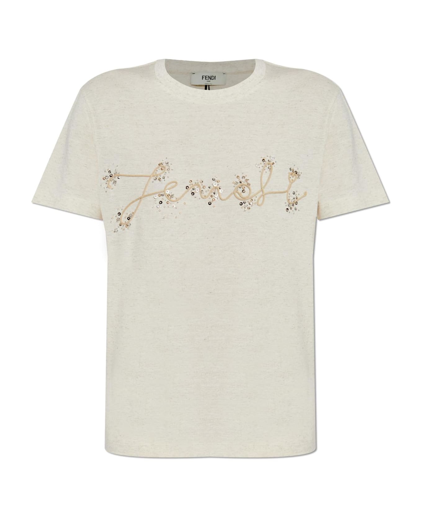 Elevate your everyday ensemble with this exquisitely crafted Fendi T-shirt adorned with shimmering applications. Rendered in a soft, high-quality knit featuring a delicate melange of creamy hues this short-sleeve top embodies understated luxury with its classic, relaxed silhouette and refined round neckline. At the heart of its allure lies a sophisticated, tone-on-tone decorative script on the front, meticulously created with corded embroidery and lavishly embellished with champagne, gold, silver, and clear sparkling accents. Embodying Fendi's enduring Italian artistry and innovation, this piece delivers subtle glamour while ensuring exceptional comfort. Why choose this product? Premium blend of cotton, polyester, and linen for a luxurious handfeel Eye-catching embellishments offer an elegant, unique finish Classic design by renowned Italian house Fendi Effortlessly complements both casual and sophisticated wardrobes Composition: 65% Cotton 20% Polyester 15% Linen Color: Saz Raffia Model number: FS7254ASMH