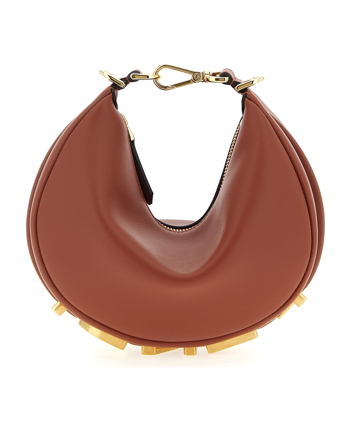 'Fendigraphy' mini handbag in calf leather, antiqued effect metal lettering logo on the bottom of the bag, top zip closure, hook and snap hook to be used as a handle, adjustable and removable shoulder strap. Composition: 100% calfskin leather (Bos Taurus) Made in: Italy Color: Brown Size and fit: - W 20 x H 13 x D 7.5 cm Model number: 8BS081A5DYF1TW4