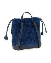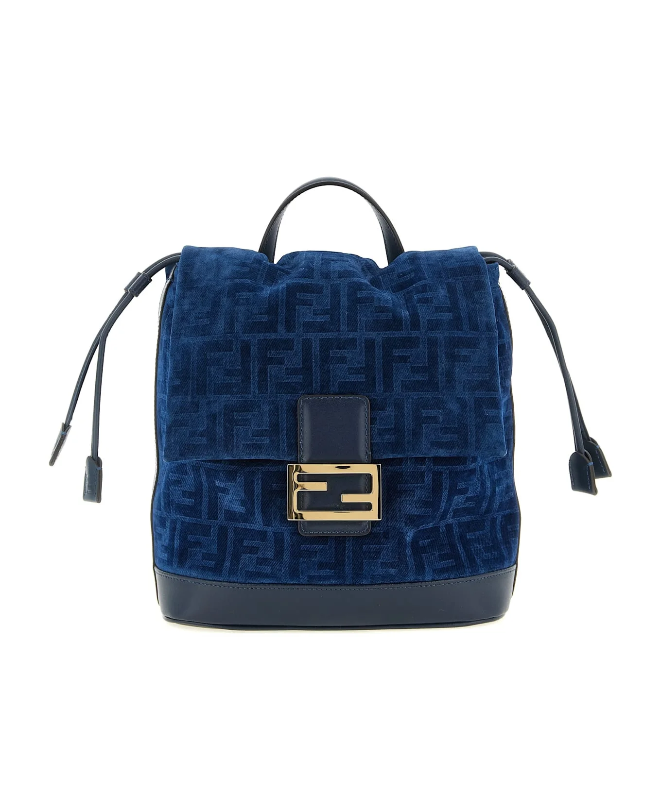 FF flocked cotton denim backpack and tone-on-tone smooth calf leather, magnetic flap closure with front metal FF buckle detail, inner drawstring, fixed handle, adjustable shoulder straps, rigid base. Composition: 85% cotton 15% viscose Made in: Italy Color: Blue Size and fit: - W 23 x H 26 x D 12 cm Model number: 8BZ057AWDVF1UJW