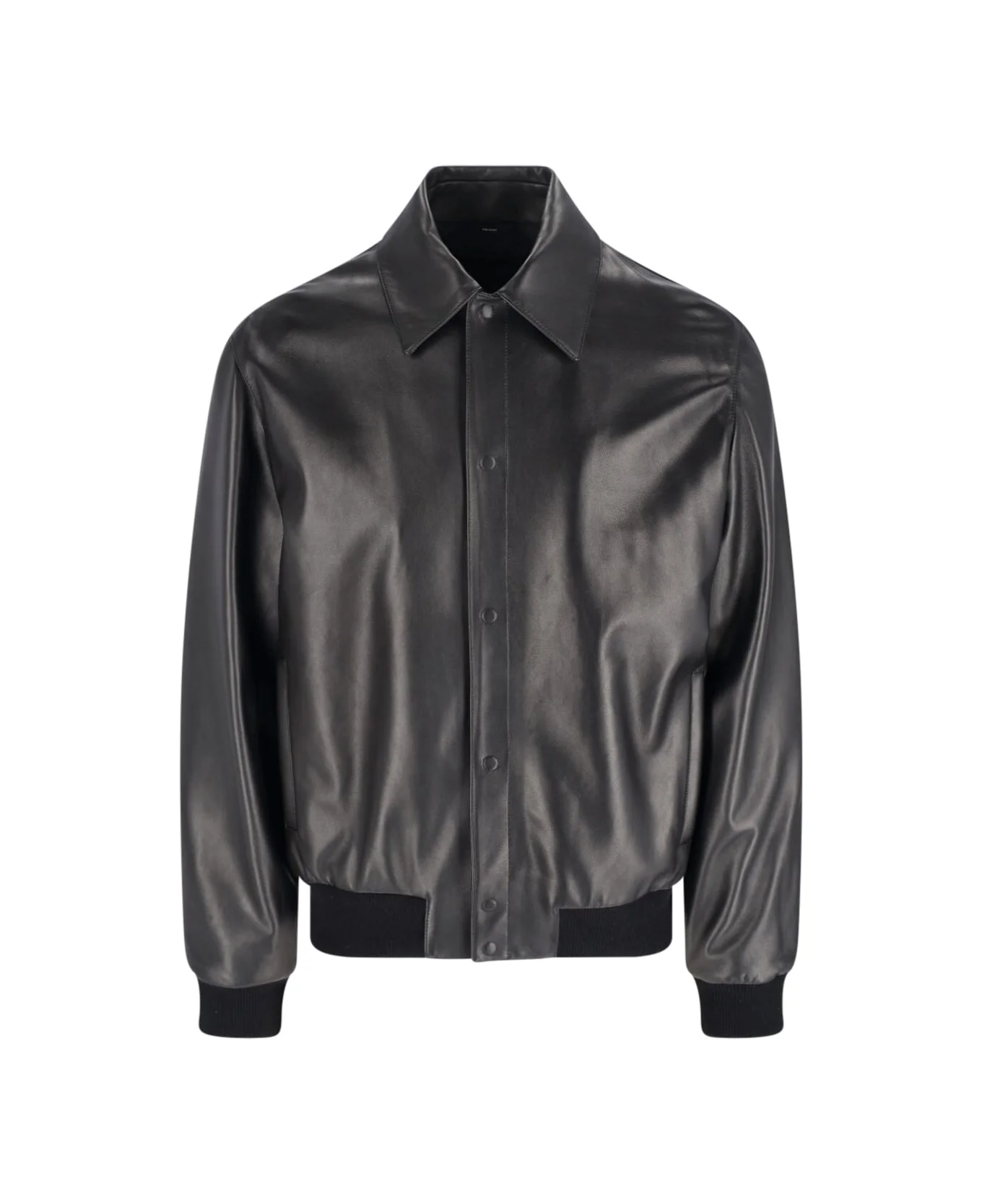 Fendi black lambskin jacket with classic collar, front button closure, long sleeves, two vertical side welt pockets, lettering logo embroidery at the back, ribbed trim, straight hem. Composition: 100% Lamb Leather Made in: Italy Color: Black Size and fit: - Vestibilita regolare Model number: FPJ139ATJZF0GME
