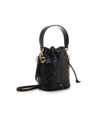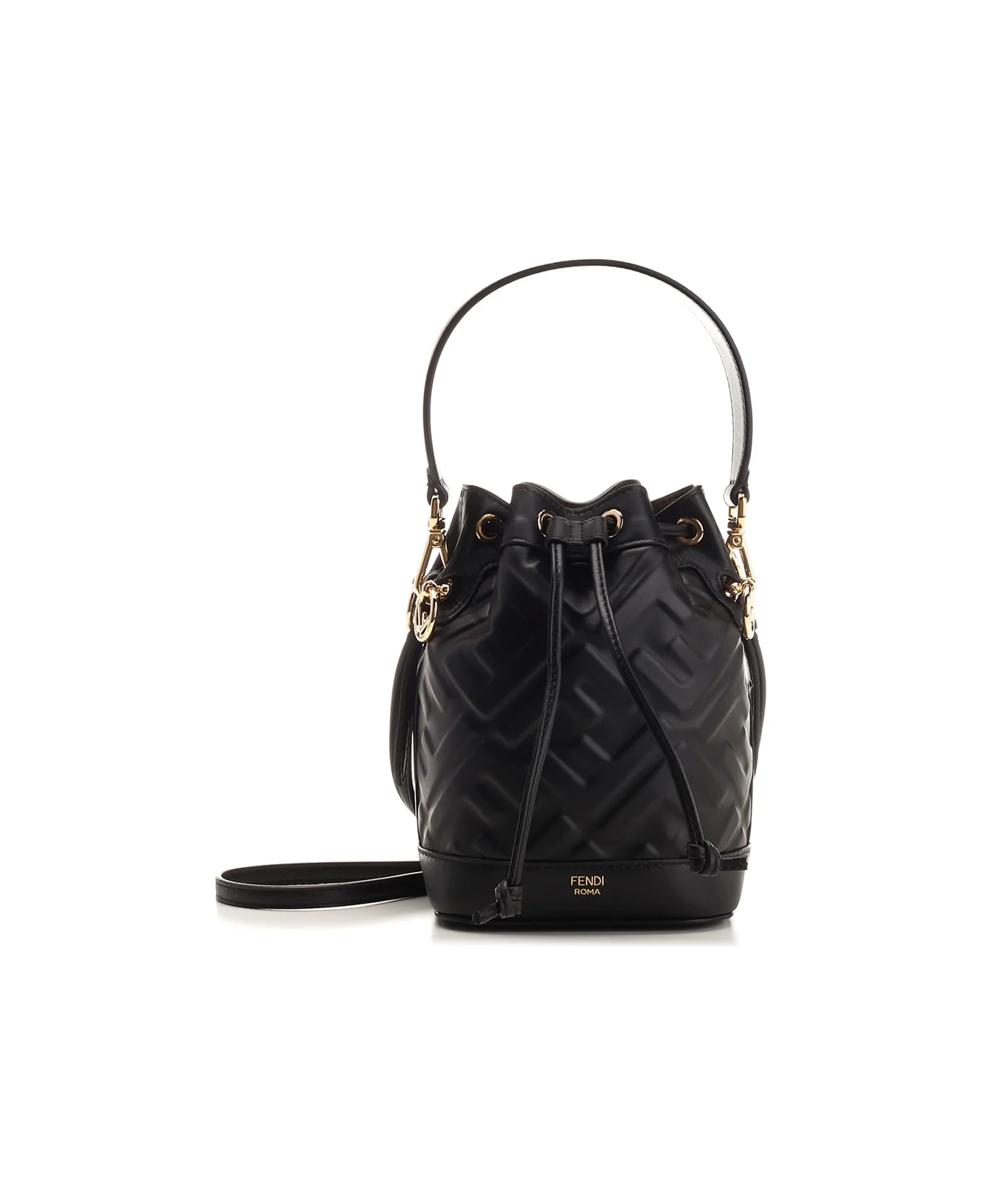 Mini 'Mon Tresor' bucket bag from Fendi in black leather with diagonal FF motif in relief with a three-dimensional texture, lined interior, two removable shoulder straps, one long and one short, metal accessories with golden finish. Composition: 100%VIT+Interno:60%PA,40%PU Made in: Italy Color: Kur Nero Oro Soft Size and fit: - W: 13 H: 20 cm Model number: 8BS093ANWT