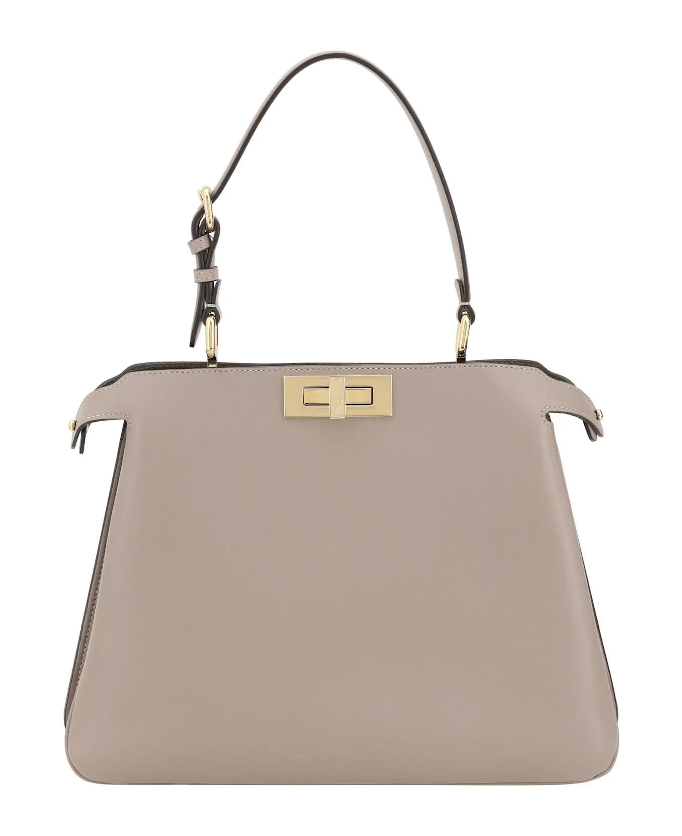 The peekaboo handbag in leather by fendi is a timeless classic that combines elegance and practicality. the adjustable top handle allows you to adapt it to your style, carrying it by hand or as a shoulder bag, depending on your preference. the hook closure on the front and back ensures safety and a touch of originality, while the refined and sophisticated design is enriched by its functionality. with three internal compartments, this bag offers ample space to best organize your objects, maintaining a clean and minimalist look. Composition: 100% % Calf Leather Bos Taurus Made in: Italy Color: Tortora Size and fit: - W 33 x H 25.5 x D 10 cm Model number: 8BN353AOVH