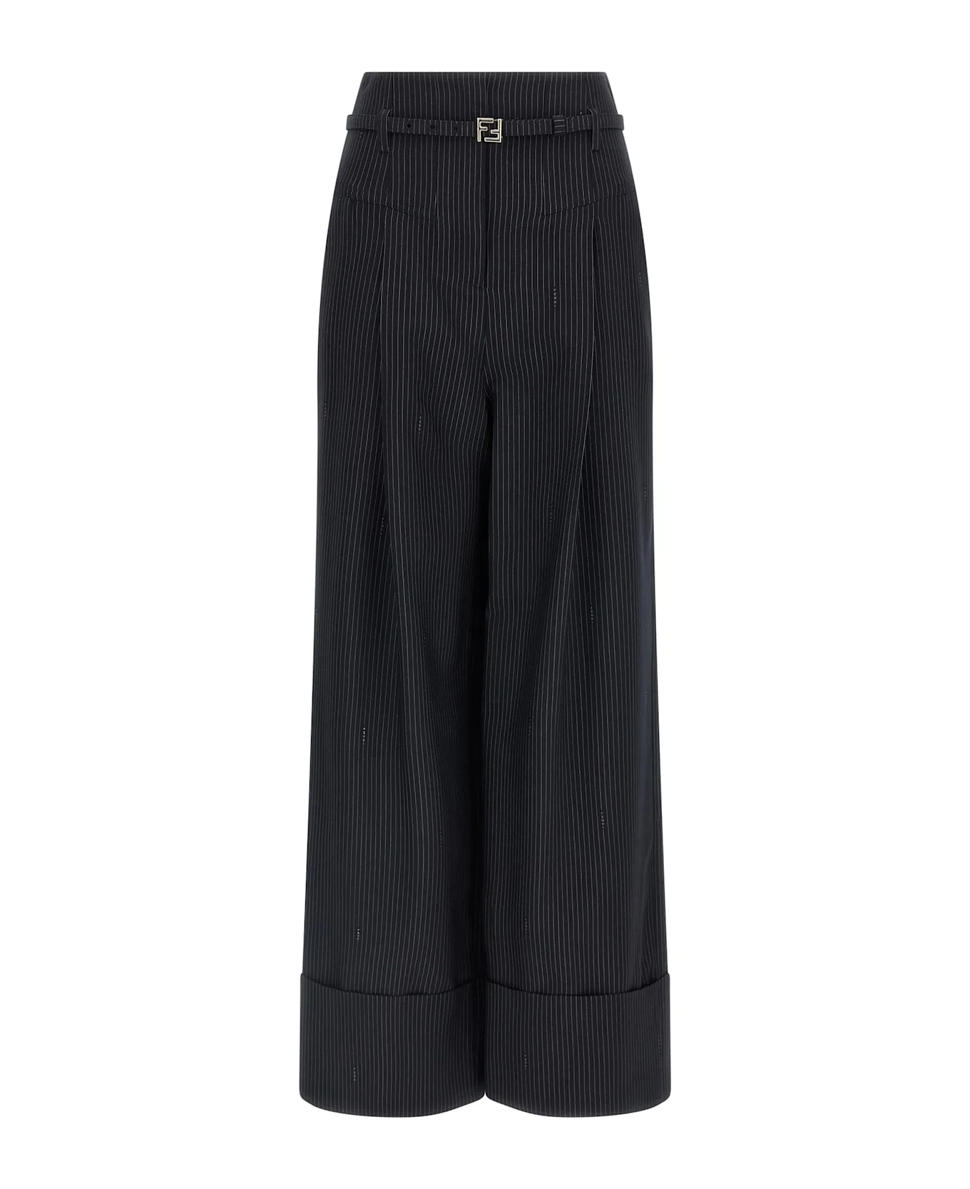 Fendi wool pants with pinstripe pattern, high waist with basque detail, front pin tucks, wide leg, hook and button zip closure, pockets, turn-up hem, belt with removable metal FF logo buckle. Composition: 80% wool, 20% viscose Made in: Italy Color: Blue Size and fit: - true to size fit Model number: FR6673AW7IF0QG3
