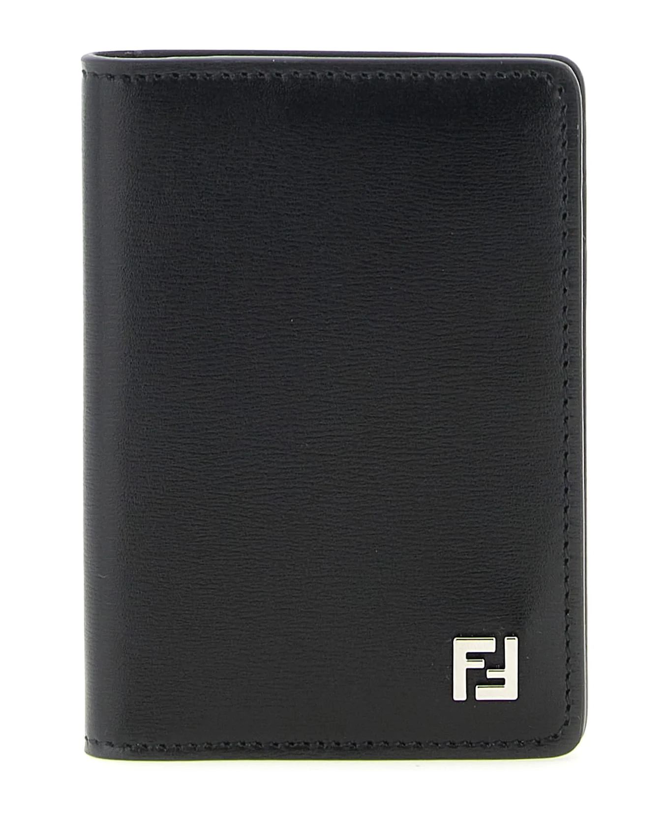 Calf leather card holder with semi-gloss finish, front metal 'Squared FF' logo, book opening. Composition: 100% calfskin leather (Bos Taurus) Made in: Italy Color: Black Size and fit: - W 7.5 x H 11 x D 0.5 cm Model number: 7M0349AVV6F0GXN