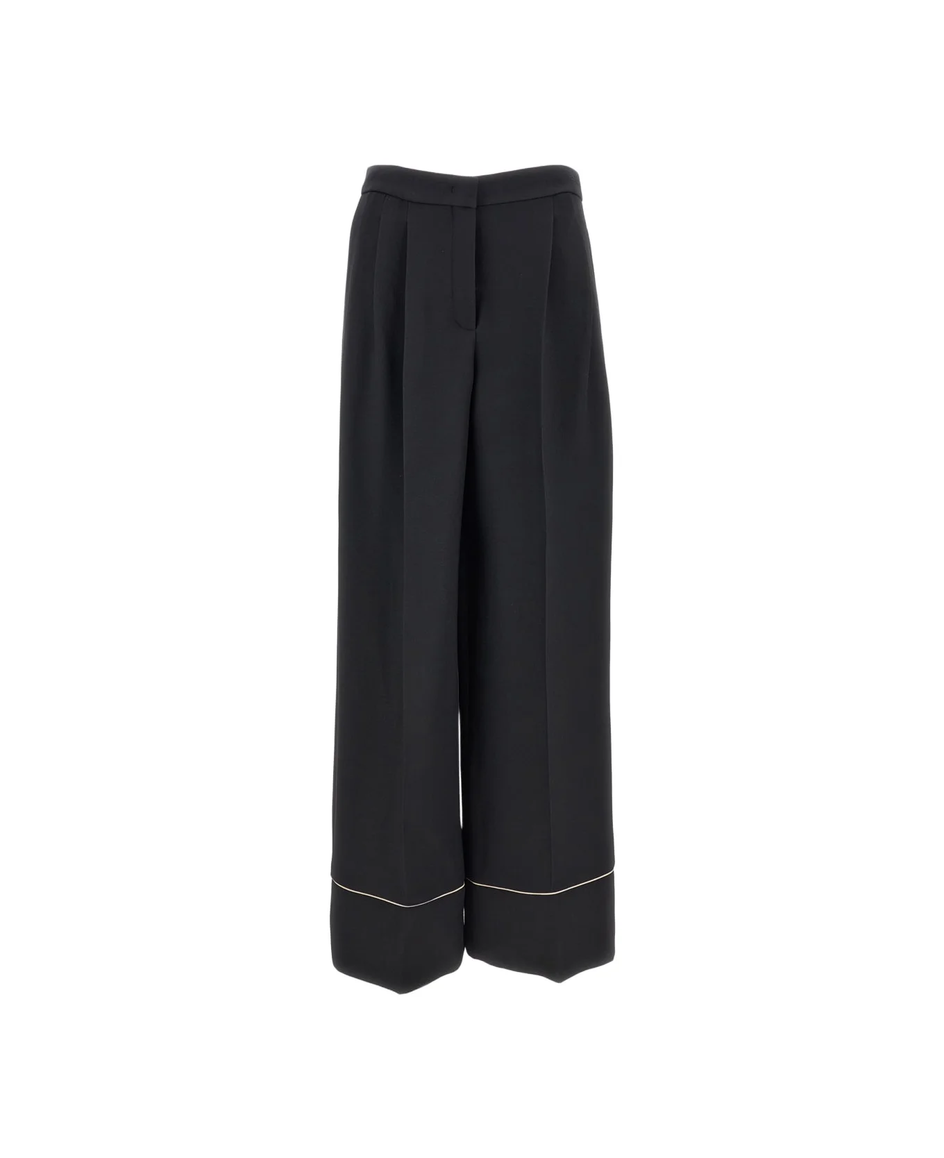 Straight-leg tailored trousers Crafted from a premium wool and silk blend Featuring a clean silhouette with pressed pleats on the front and back Finished with contrast piping along the side edges and hem Classic closure with a zip and concealed hook Equipped with side seam pockets and welt pockets at the back Color: Black Made in Italy Composition: 77% Wool, 23% Silk Made in: Italy Color: Black Model number: FR6678AC4GF0GME
