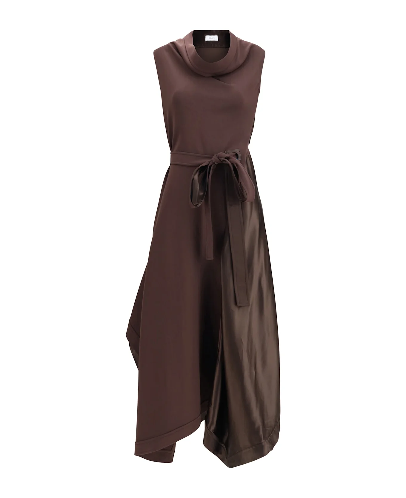 The asymmetric dress crafted from stretch viscose cady, enhanced by satin side panels that create a refined textural contrast. the draped cowl neckline softens the silhouette, while the waist is accentuated by a sash threaded through a leather-trimmed gancini-shaped eyelet. the handkerchief hem adds a dynamic, sophisticated touch, embodying modern elegance with effortless movement. Composition: 93% % Viscose, 7% % Elastane Made in: Italy Model number: 785507001