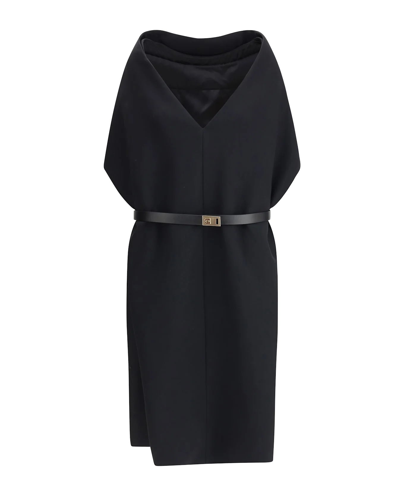 The belted midi dress by ferragamo with billowing front panel embodies sculptural sophistication, crafted from a refined blend of wool and viscose faille that balances structure and fluidity. the strong silhouette features an integrated shawl draping across the front, flowing into a deep v-cut at the back. the softly billowing cape-like panel enhances the fluid lines of the midi dress, cinched at the waist with a golden hug buckle that adds a signature ferragamo touch. Composition: 73% % Viscose, 27% % Fleece Wool Made in: Italy Model number: 788143003