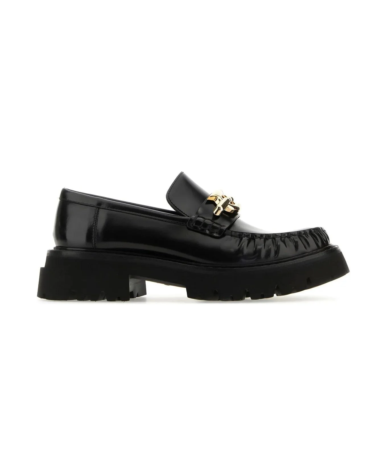 Loafers realized in polished-finish calf leather enriched by metal Gancini detail on the vamp. - Round toe - Printed logo on the inside Composition: Exterior: 100% Calf Interior: 100% Leather Sole: Rubber Made in: Italy Model number: 76390401G019NERO