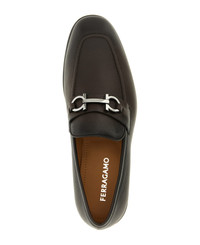 'Foster' hammered calf leather loafers with metal 'Gancini' detail on the front, almond toe, squared bowl stitching, flexible rubber sole. Composition: 100% calfskin leather (Bos Taurus) Made in: Italy Color: Brown Size and fit: - US FERRAGAMO SIZE - 3E Fit Model number: 775115TMORO
