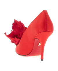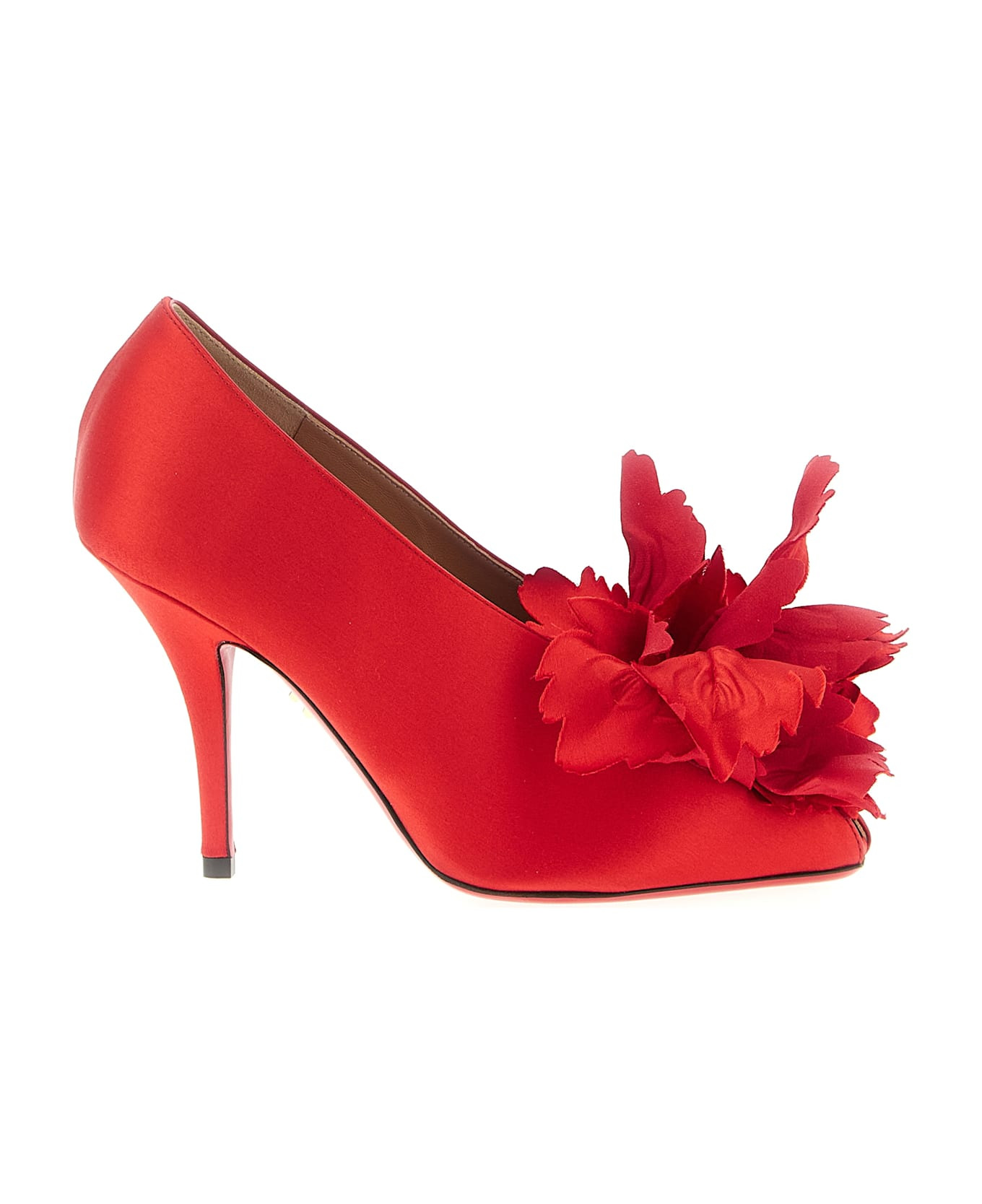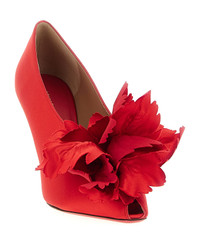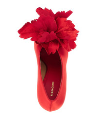 'Galia' satin pumps with peep toe model with slightly closed neckline and tone-on-tone maxi flower application on the front, stiletto heel, leather sole. Composition: 90% viscose, 10% lamb leather Made in: Italy Color: Red Size and fit: - US FERRAGAMO SIZE - C fit Heel: 9 cm Model number: 787583FLAMERED