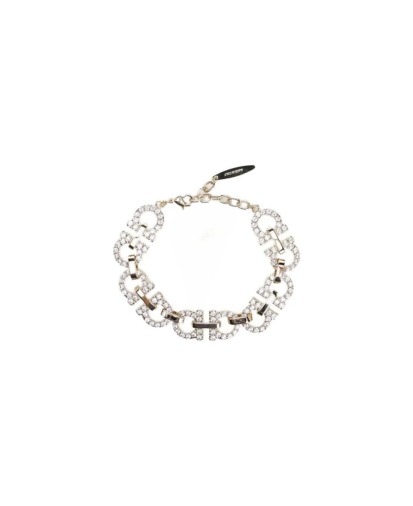 Ferragamo 'Gancini' bracelet with crystals in brass, composed of a Gancini chain with applied crystals, adjustable clasp closure and personalized tag. Composition: 80% BRASS 20% GLASS # # # Composition: 80% Brass, 20% Glass Made in: Italy Color: Gold Size and fit: - LUNGHEZZA TOTALE: 19cm Model number: 760898786537