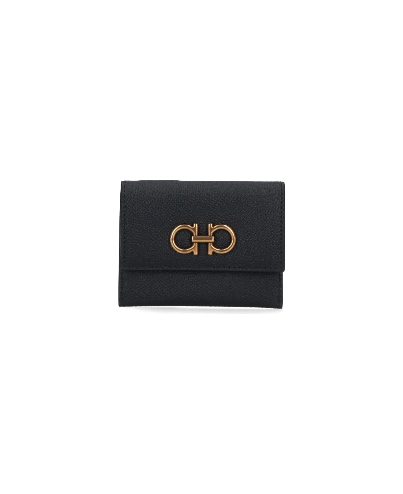 Ferragamo Gancini card holder in black calf leather, button flap closure on the front, gold metal 'Gancini' detail on the front, three internal card slots, and an external flat pocket on the back. Composition: 100% Calf Leather Made in: Italy Color: Black Size and fit: - A 7.5 X L 10 X P 0.5 CM Model number: 779901001