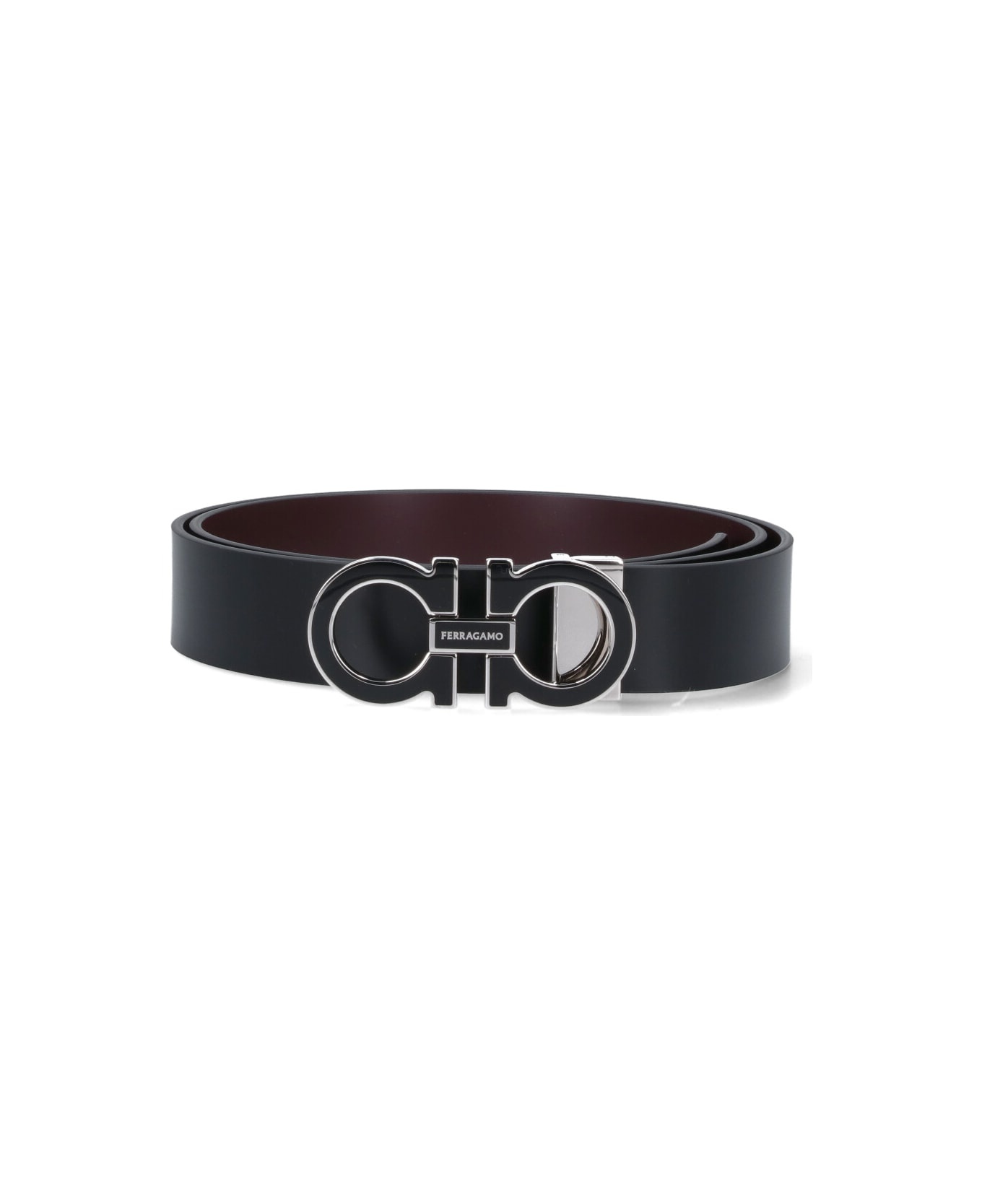 Ferragamo 'Gancini' reversible belt in black leather on one side, brown on the other, removable black enameled metal logo buckle on the front, adjustable engraved logo detail on the front. Composition: 100% Calf Leather Made in: Italy Color: Black-brown Model number: 670384776399001