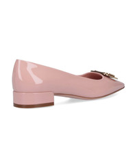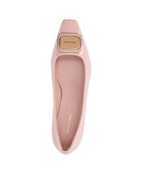 Ferragamo New Vara Plate pumps in pink patent leather with square toe, Vara Plate gold metal applique, black logo print detail, slip-on fit, square heel, beige leather sole. Composition: 100% Patent Leather Made in: Italy Color: Pink Size and fit: - altezza tacco 2 cm Model number: 775260002