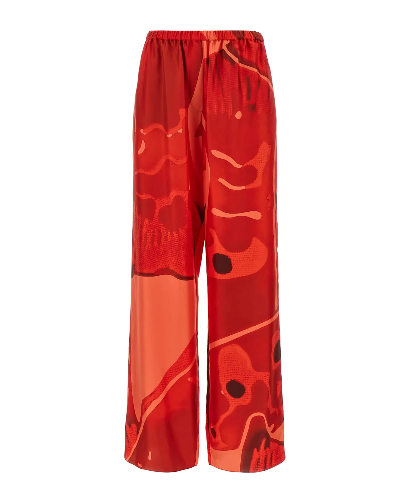 Summer print silk pants, palazzo style with wide and straight leg, elastic waistband, trompe l'oeil flap, pockets. Composition: 100% silk Made in: Italy Color: Red Size and fit: - true to size fit Model number: 783412CORALNEWRED