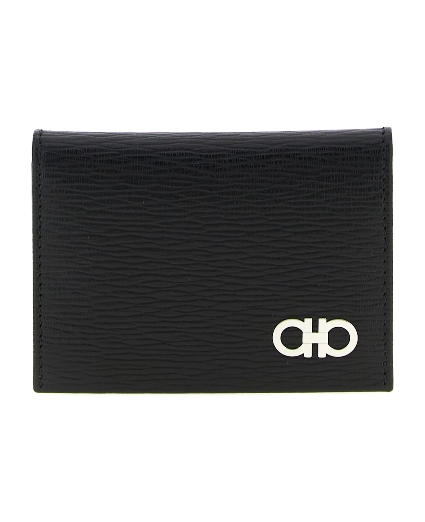 'Revival gancio' textured leather card holder with contrast metal logo and contrasting blue interior. Composition: 100% calfskin leather (Bos Taurus) Made in: Italy Color: Black Size and fit: - W 10.5 x H 7.5 x D 2.5 cm Model number: 685949NERO