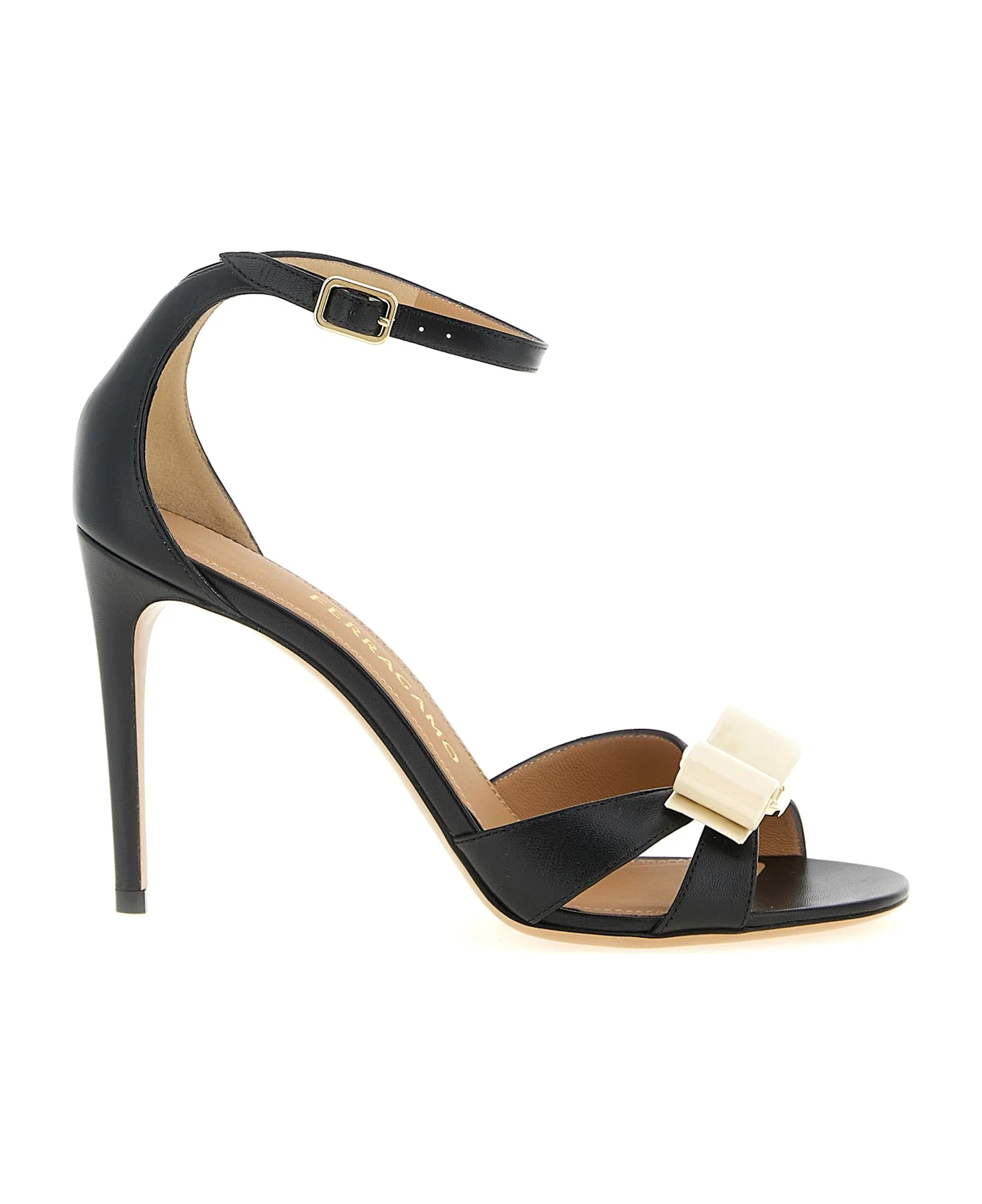 'Roxy' leather sandals with 'Vara' bow detail in patent leather and front metal, adjustable ankle strap with V-line above the heel, stiletto heel, leather sole. Composition: 90% goat leather 10% calfskin leather Made in: Italy Color: Black Size and fit: - US FERRAGAMO SIZE - C fit Heel: 9 cm Model number: 791390NERO