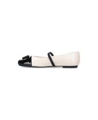 Ferragamo Vara ballet flats in white leather with contrasting square toe, gold metal bow detail and black grosgrain, elastic top strap, slip-on fit, and leather sole. Composition: 100% Lambskin Made in: Italy Color: Cream Model number: 777437001
