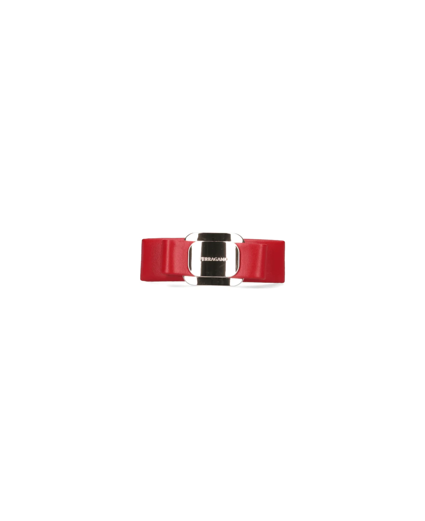 Ferragamo "Vara" red calf leather hair clip with bow detail on the front, logo embossed on gold metal on the front, and back closure. Composition: 70% Calf Leather, 15% Brass, 15% Plastic Made in: Italy Color: Red Model number: 791473001