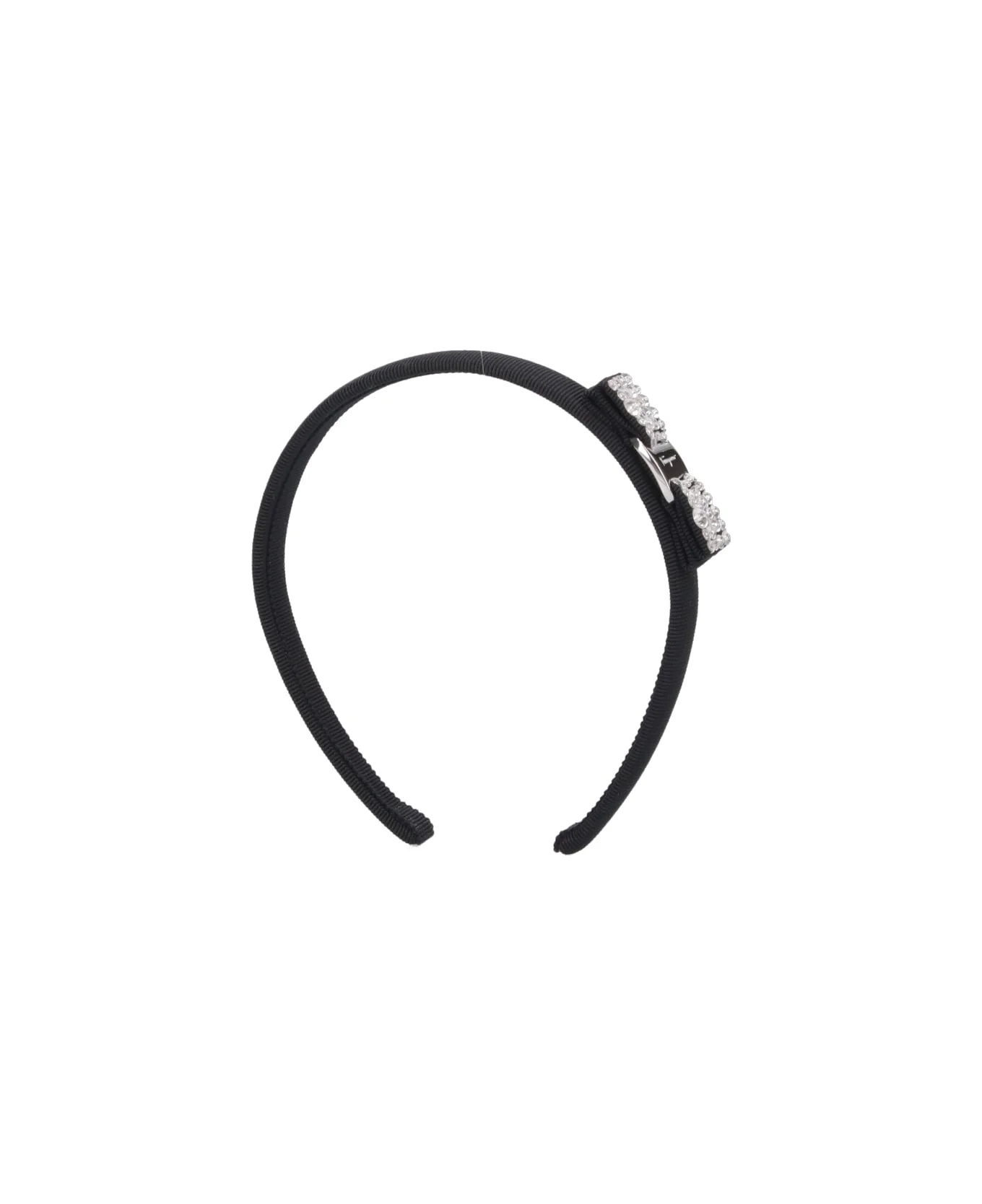 Ferragamo Vara headband in black fabric with all-over ribbed pattern, jewel bow detail applique on the side. Composition: 35% Cotton, 35% Rayon, 15% Plastic, 10% Brass, 5% Acrylic Made in: Italy Color: Black Model number: 713034001