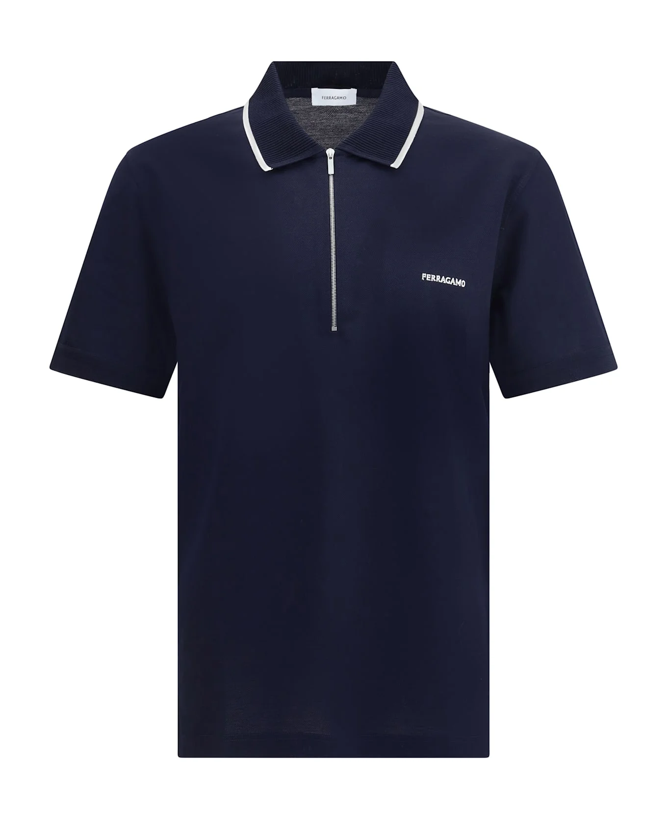 Cotton polo shirt by ferragamo has a refined and contemporary design. the classic collar is defined by a contrasting profile, while the zipper front closure adds a modern touch. the iconic ferragamo monogram, embroidered in contrast on the chest, signs the garment with discreet elegance. ideal for polished yet casual looks. Composition: 100% % Cotton Made in: Italy Color: BLUE Model number: 1447970784281