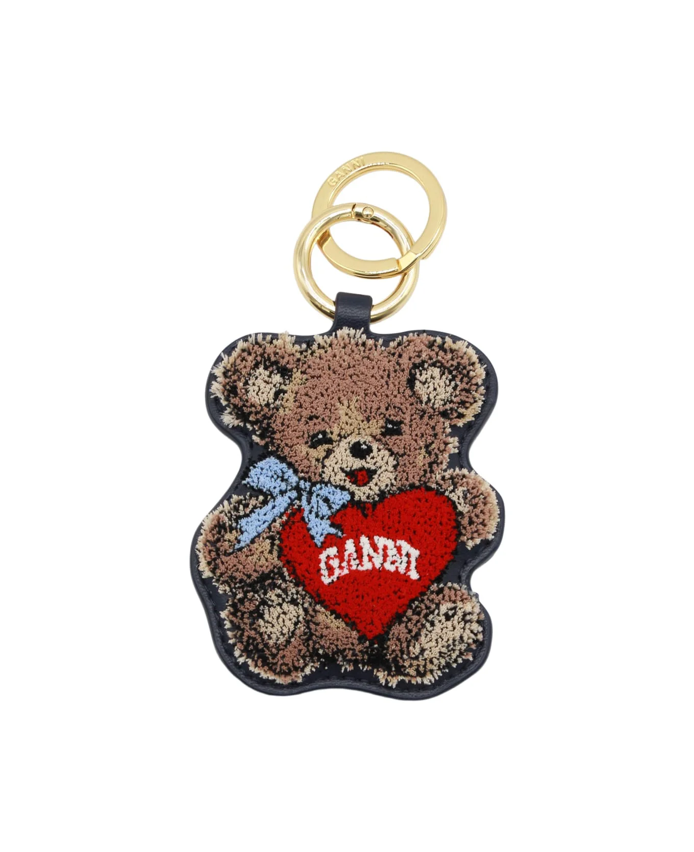 Black leather keyring from Ganni featuring gold tone hardware. Composition: _, 65% Recyled Le, 19% Plu, 16% Polyester Made in: China Color: BLACK/IRIS Model number: B3010055096