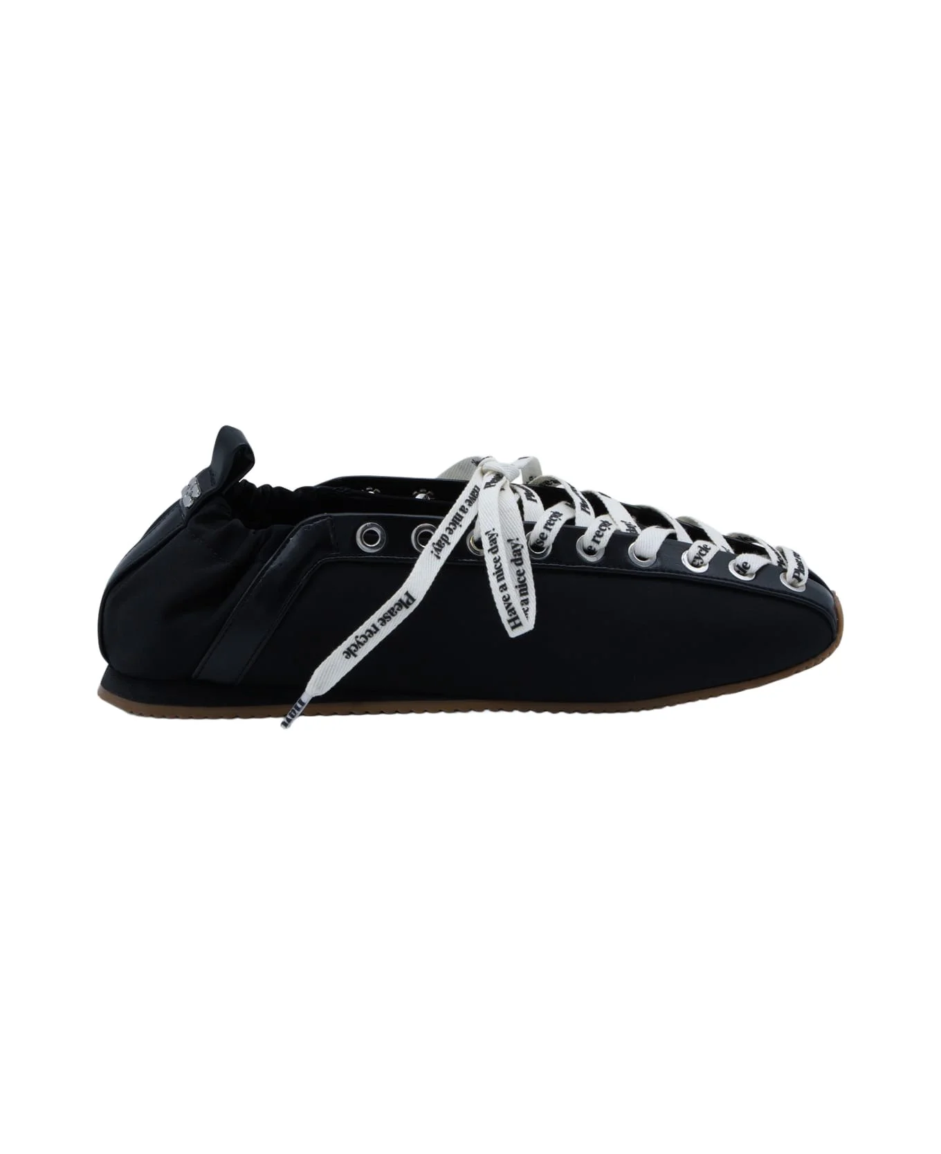 Black Sporty flats from Ganni featuring details in smooth leather effect fabric, rounded square toe, elastic back, lace closure, rubber sole. Composition: 93% Polyamide, 7% Polyurethane Made in: Brazil Color: Black Model number: B1040014099