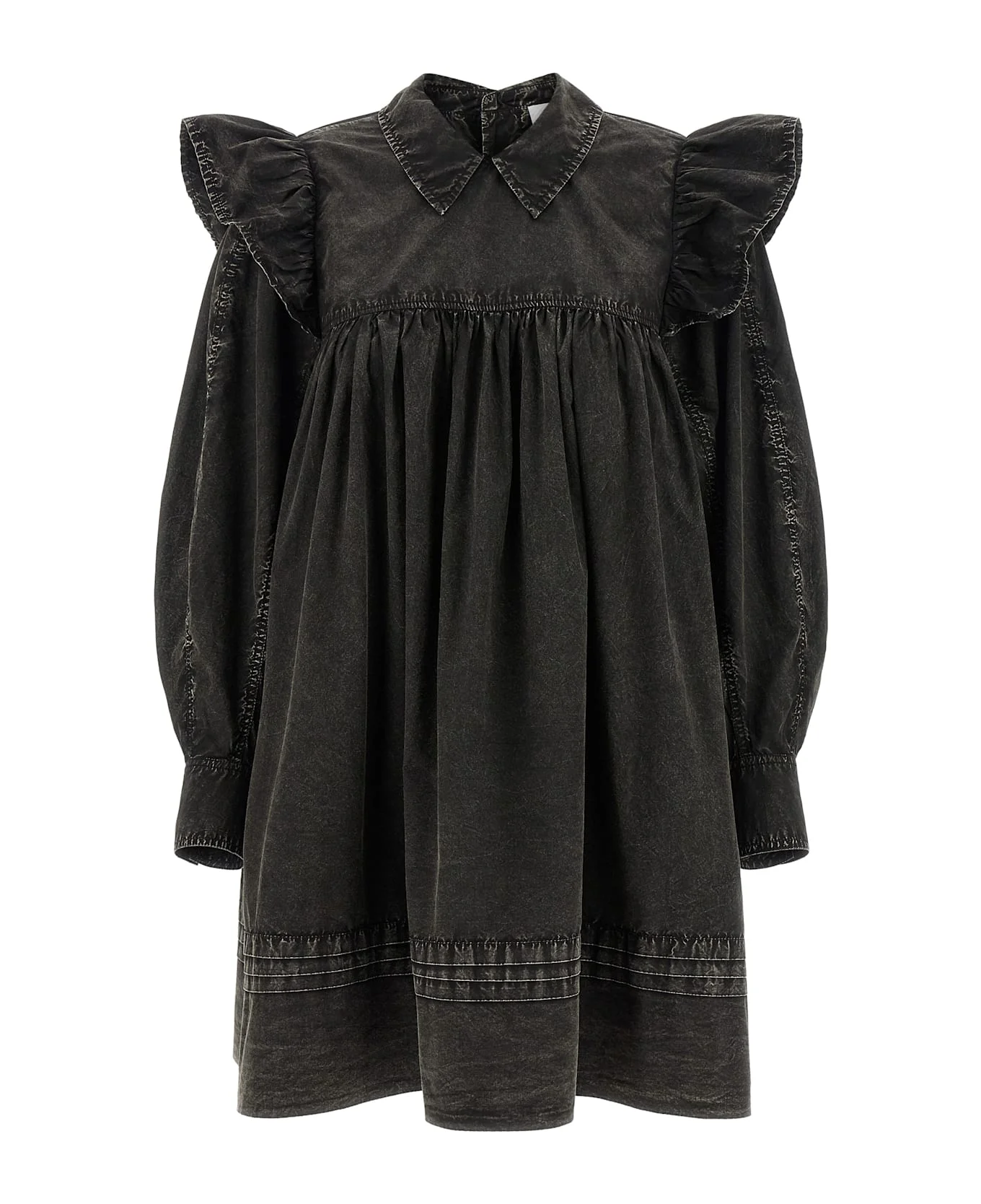 'Black Washed Mini Shirt' cotton dress with delave effect garment, shirt model with curls and mini flounces front and back, long wide sleeves with cuffs and maxi ruffles on the shoulder, back button closure, pockets, unlined. SUSTAINABLE: This product is made of organic cotton. Composition: 100% organic cotton Made in: India Color: Black Size and fit: - relaxed fit - EU size Model number: A1030125099