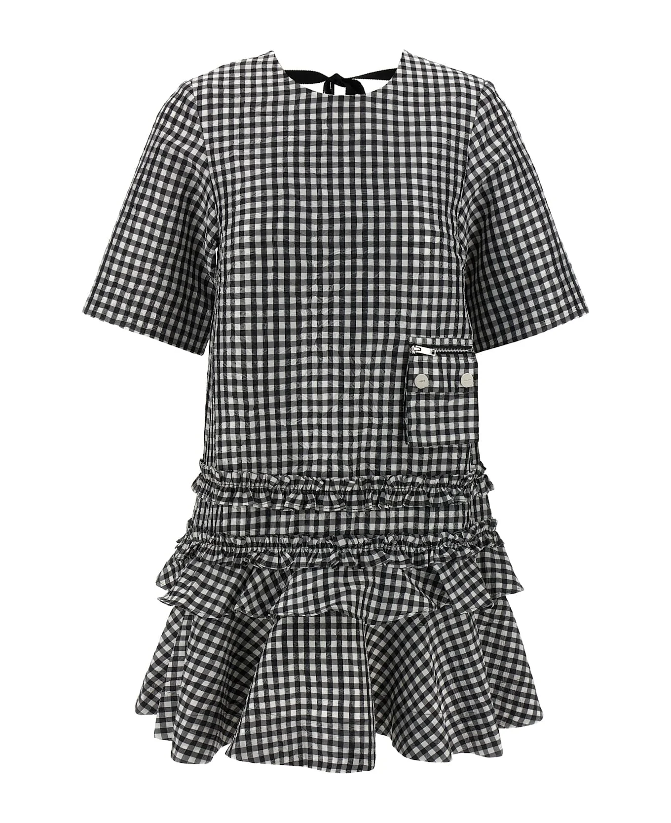'Crinkled Check Mini' dress in crinkled vichy fabric with crewneck, short sleeves, pocket, wide round neckline at the back with drawstring and zip closure, skirt with ruffles and flounces. SUSTAINABLE: Product made from recycled polyester. Composition: 100% polyester Made in: Turkey Color: White/Black Size and fit: - true to size fit - EU size Model number: W0464099