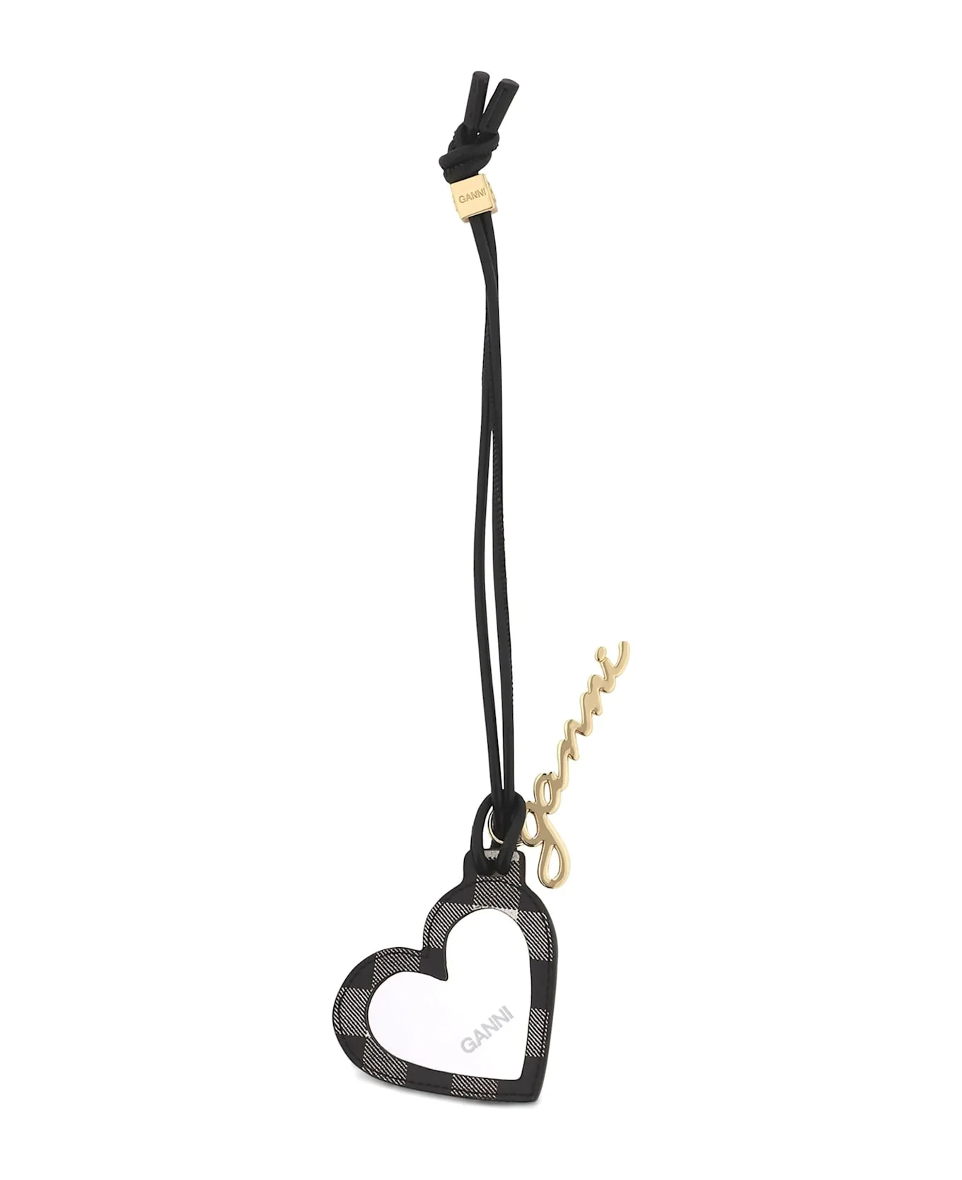 Black GANNI heart-shaped charm with a mirror. Composition: 65% Recycled Leather, 19% Polyurethane, 16% Polyester Made in: China Color: Black Model number: A6762099