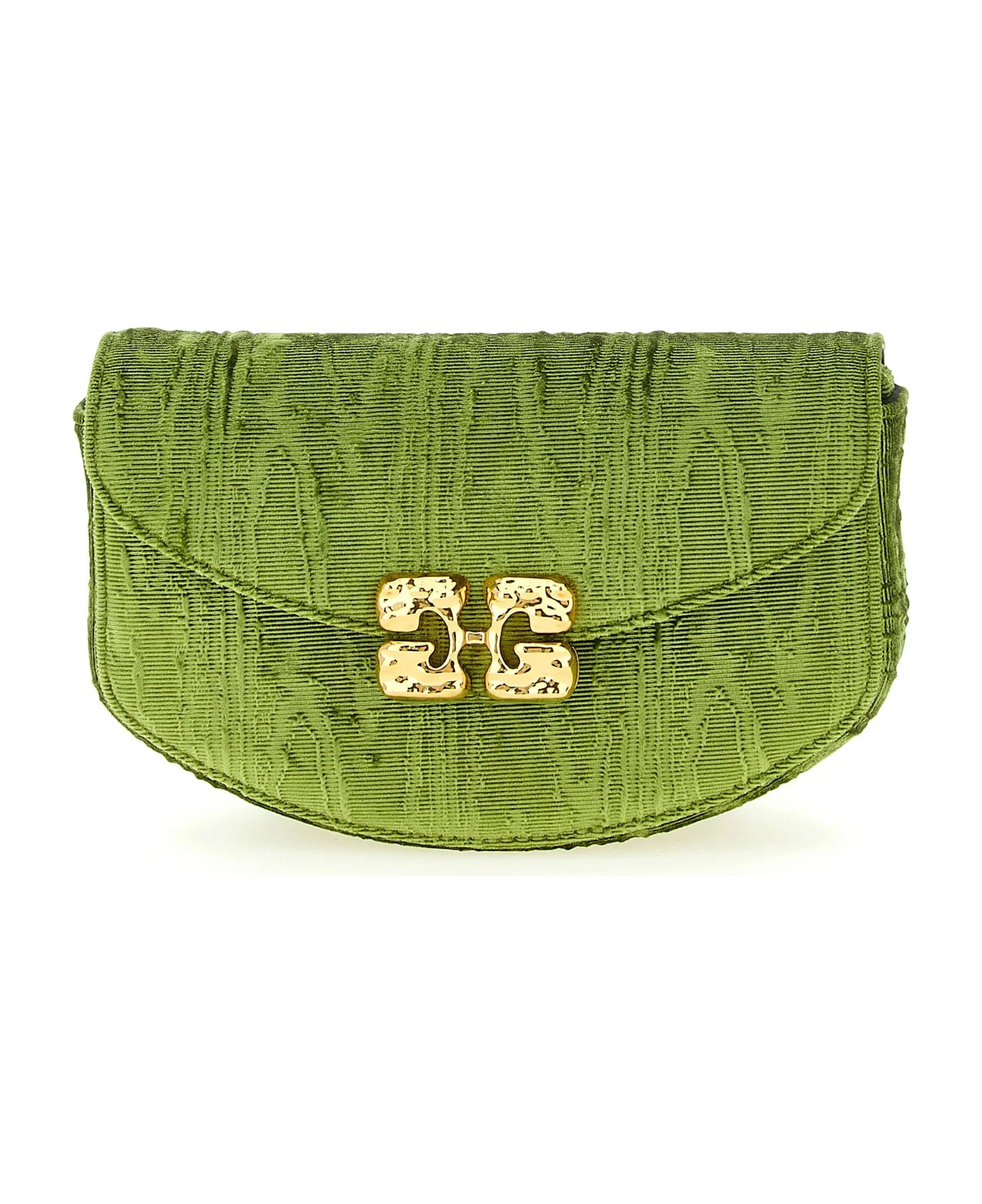 'Lulu' moire velvet wallet On Chain, magnetic flap closure with metal 'GANNI Butterfly' logo on the front, removable chain shoulder strap. Composition: 94% polyester 6% elastane Made in: China Color: Green Size and fit: - W 18 x H 12 x D 4.5 cm Model number: B2060015496