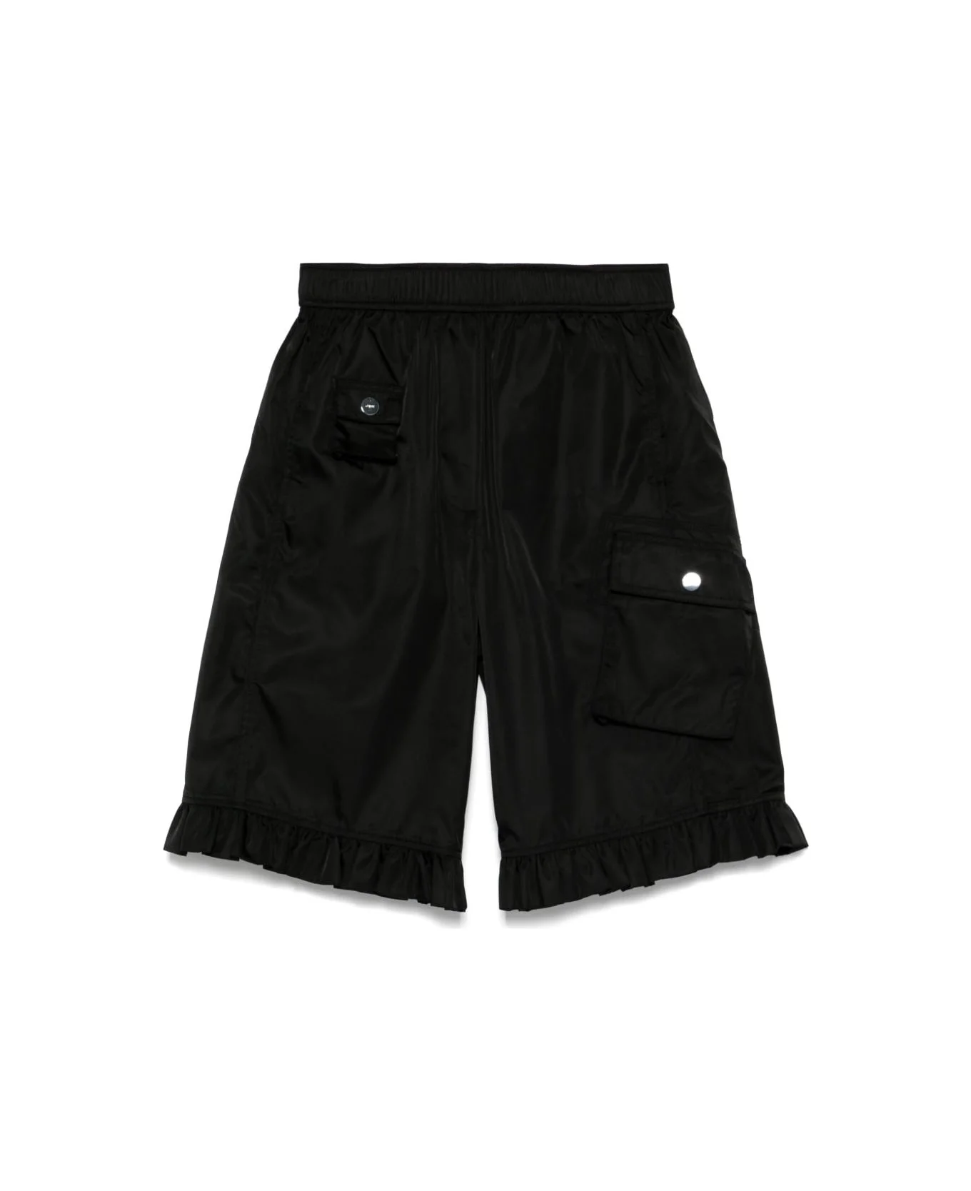 black elasticated waistband two side inset pockets two side cargo pockets ruffle hem Made in: China Color: Black Model number: W0411099